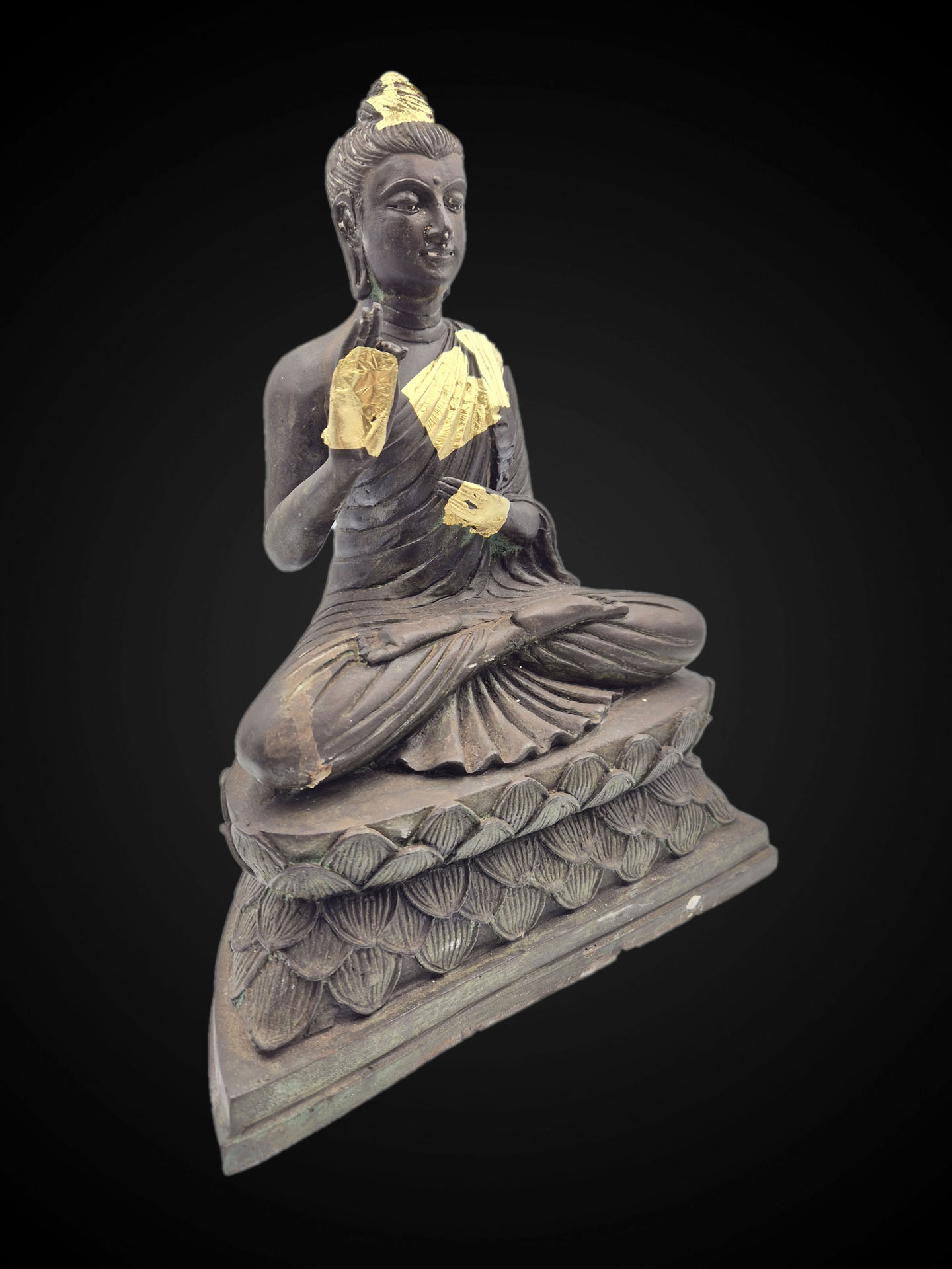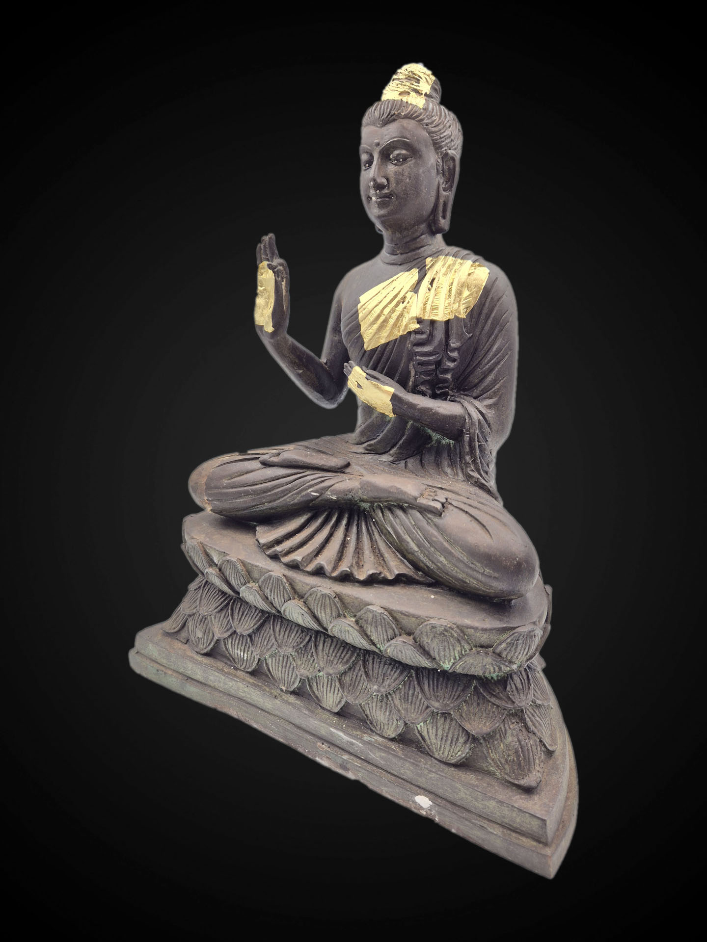 Distinctive elements — including the layered lotus pedestal and deeply carved robe folds — express the stylistic vocabulary of this lineage. The bronze surface displays a mature, naturally developed patina, giving the statue a composed and time-softened presence.