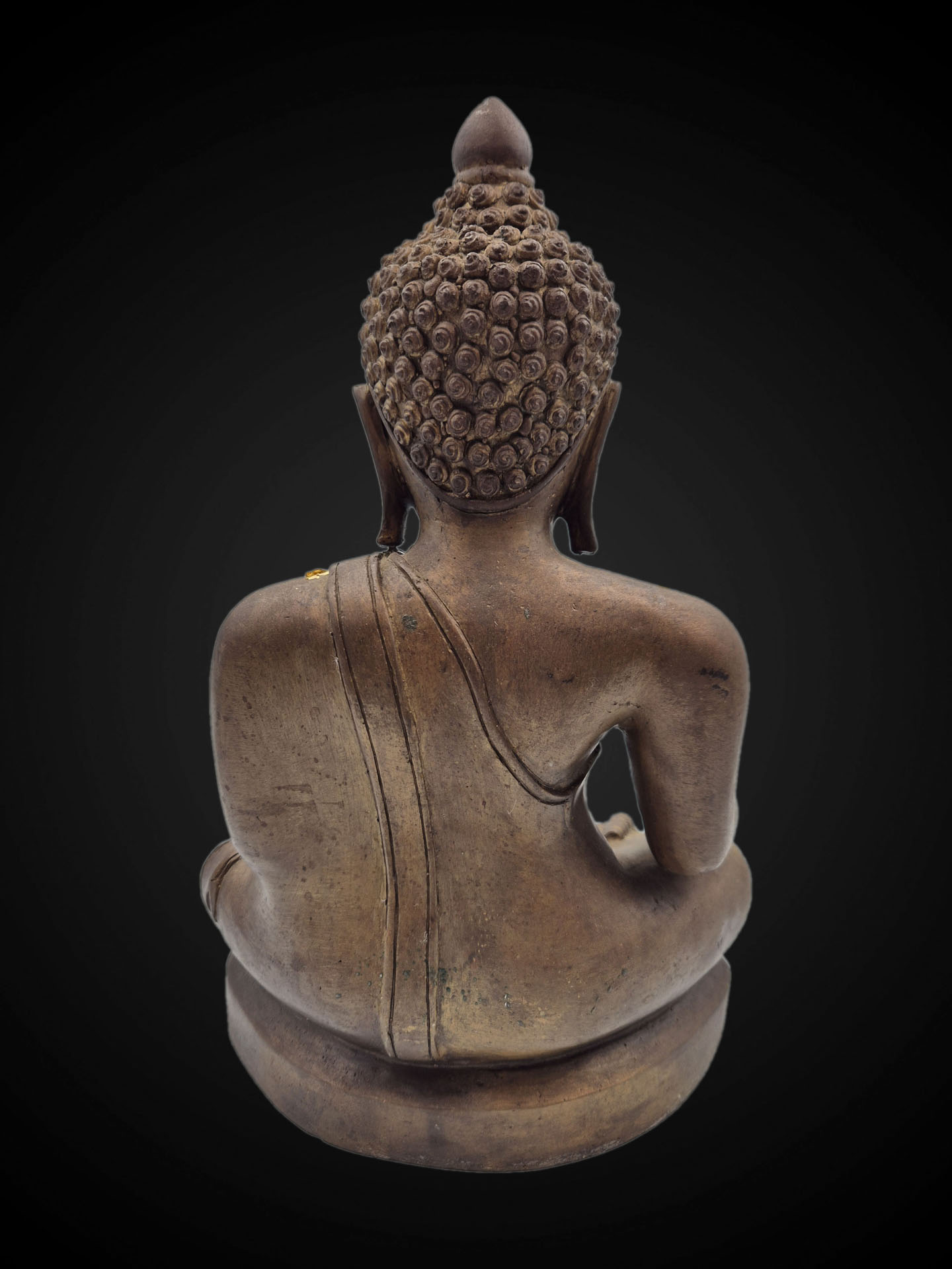 This Ayutthaya-style seated Buddha is depicted in the Bhumisparsha Mudra (Earth-Touching posture), representing the moment of enlightenment where the Buddha calls the earth to witness his awakening.