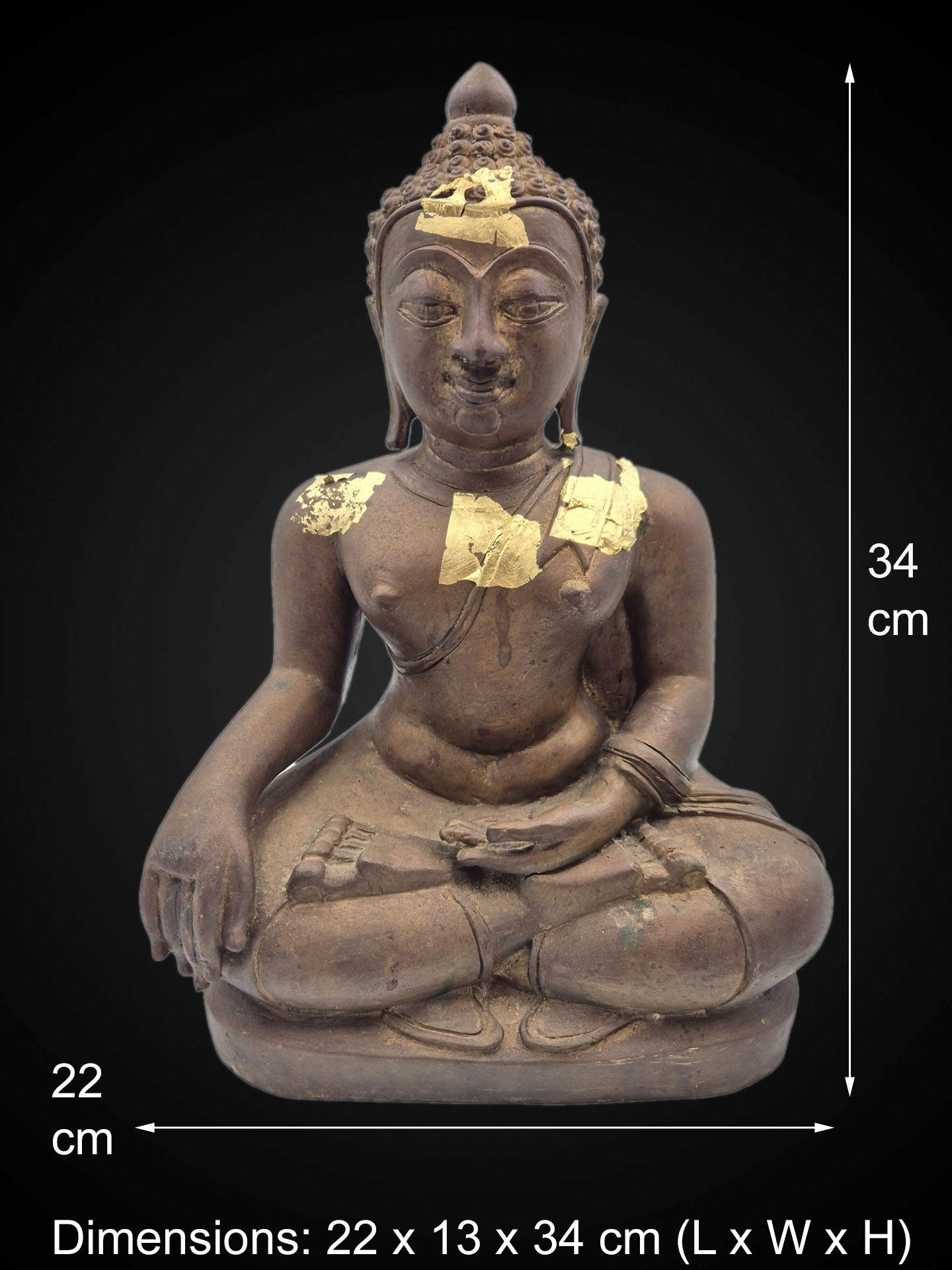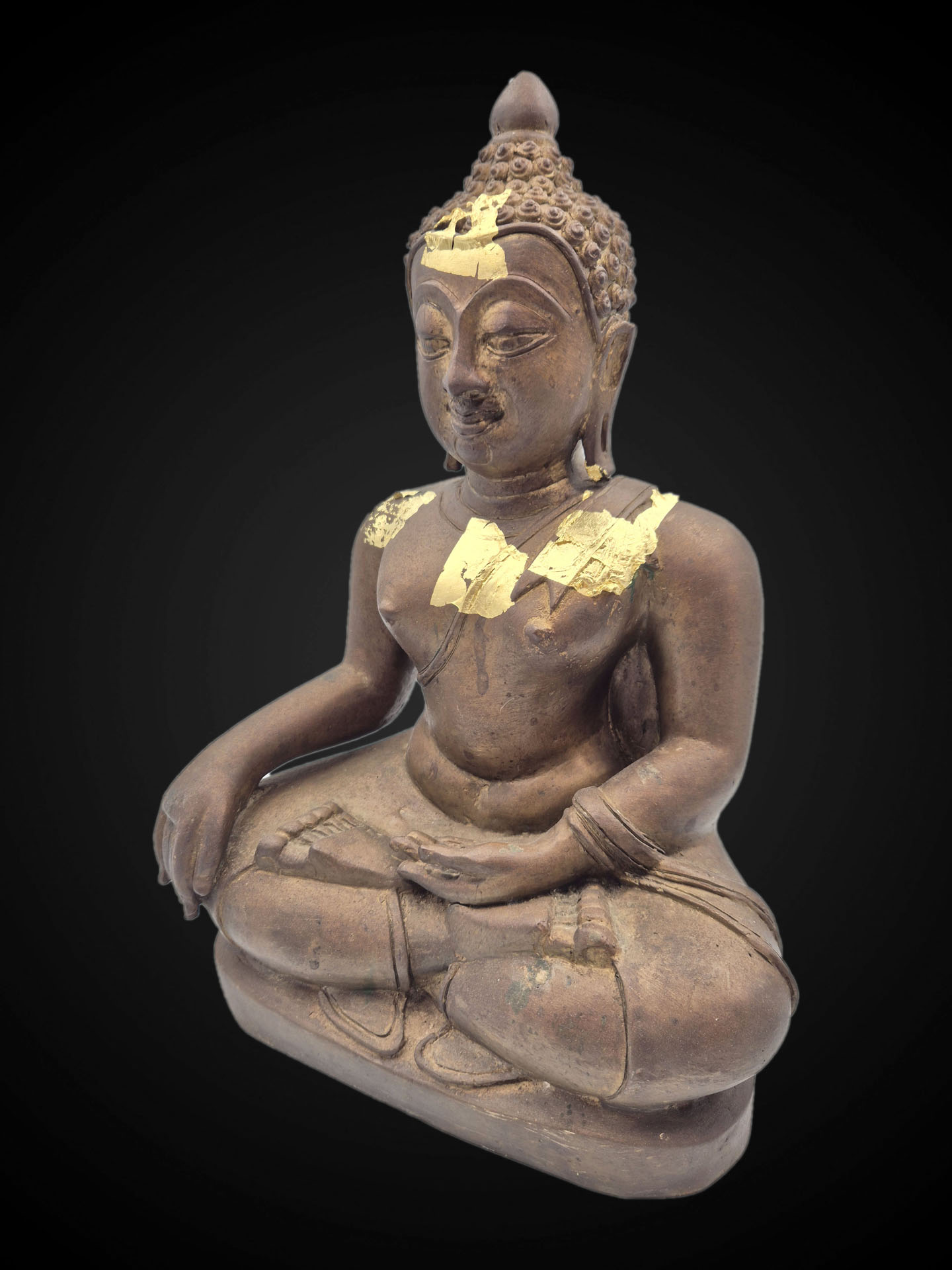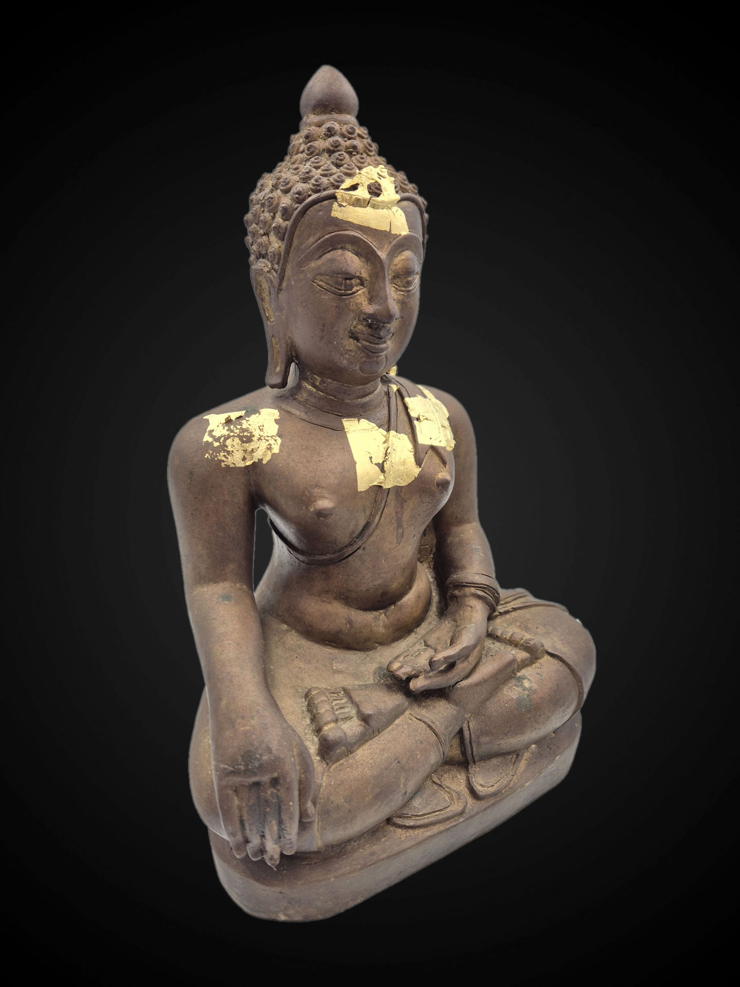 The composition reflects the refined sculptural language associated with the Ayutthaya tradition, where figures are presented with balanced proportions, calm expression, and a composed spiritual presence. The seated posture conveys grounding, stability, and inner realization.