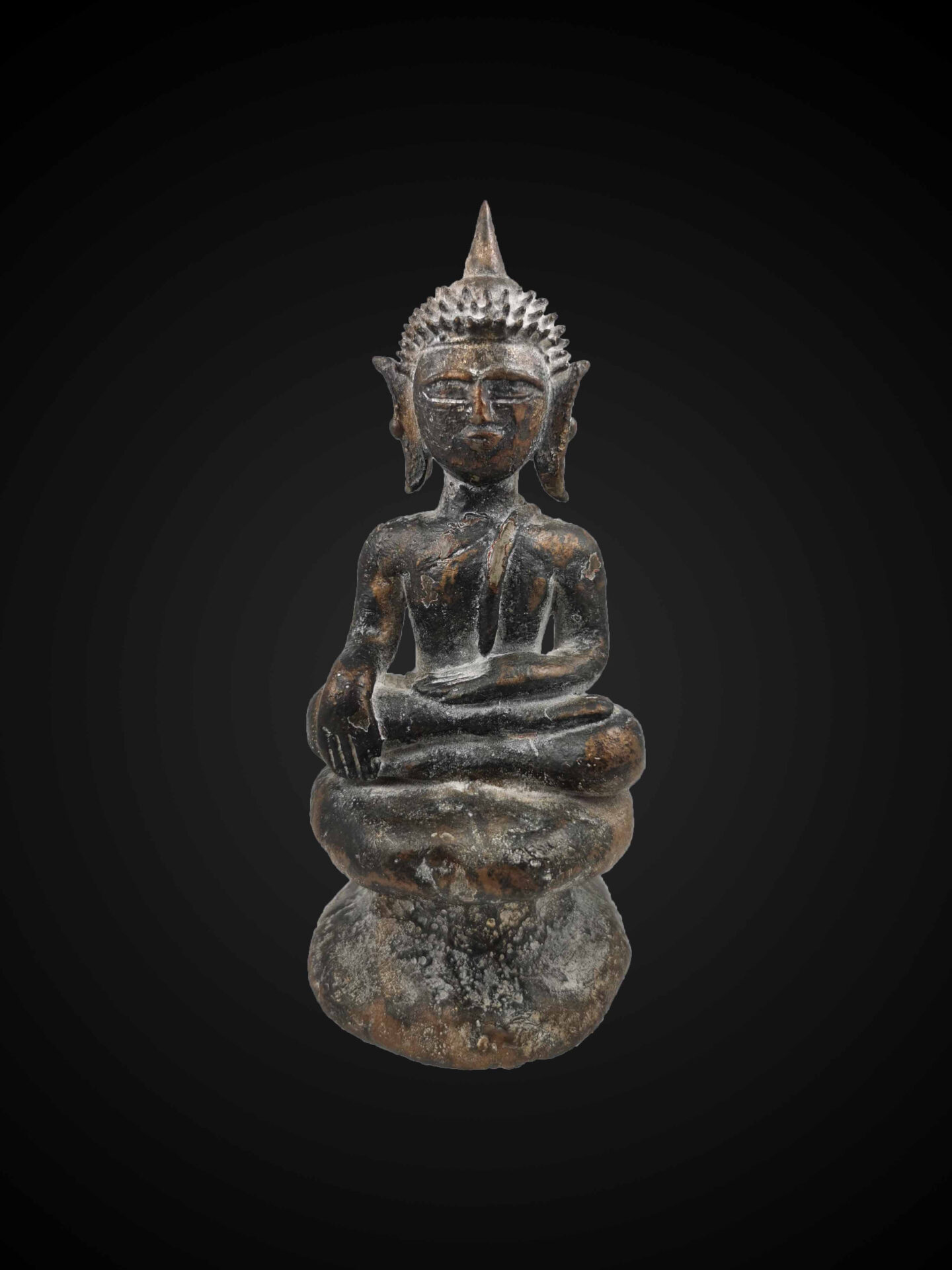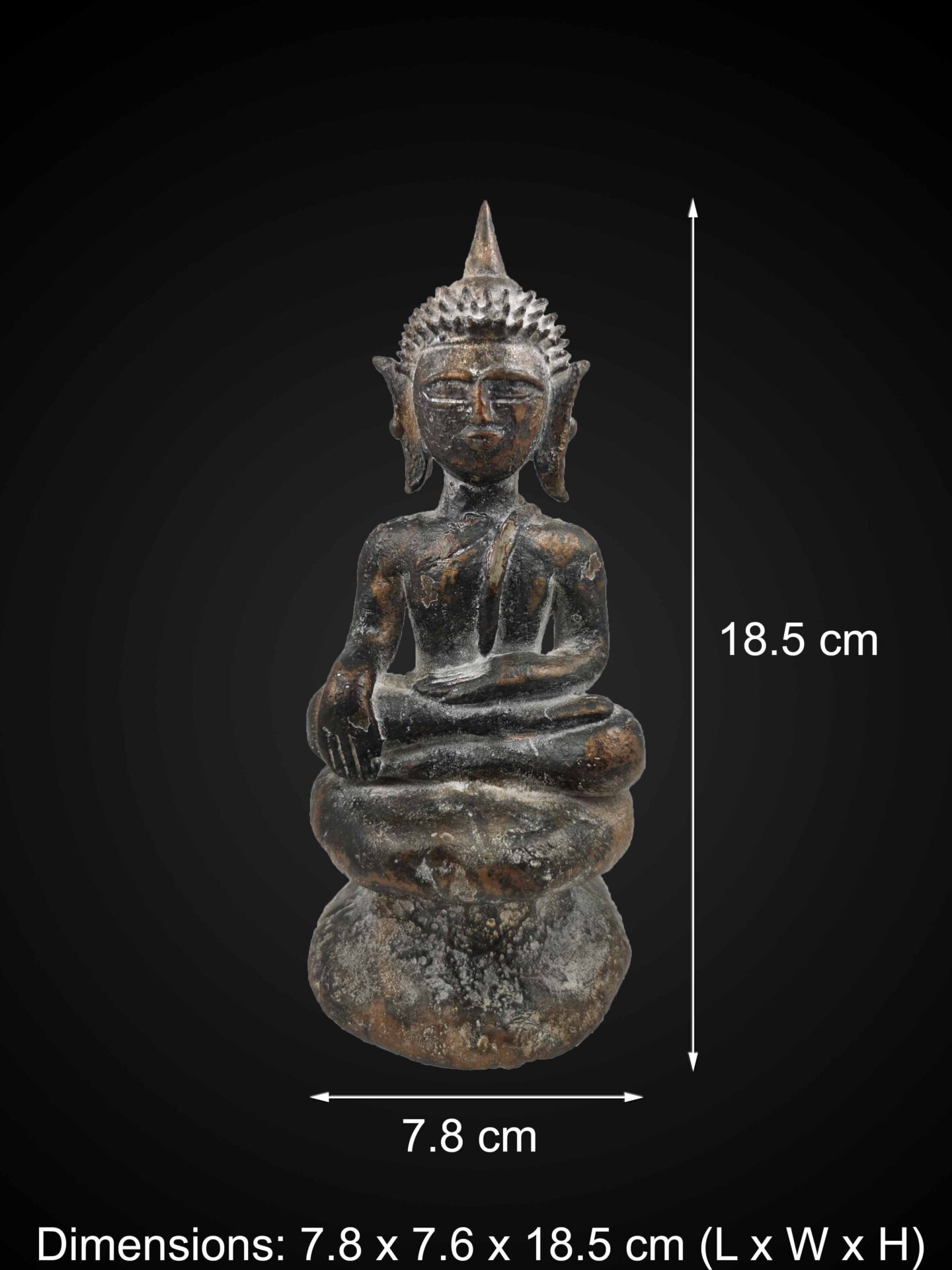 This seated Buddha is depicted in the Earth-Touching posture (Bhūmisparśa Mudra), symbolising steadfast resolve and the moment of awakening. The right hand extends downward toward the earth while the left rests calmly in meditation.