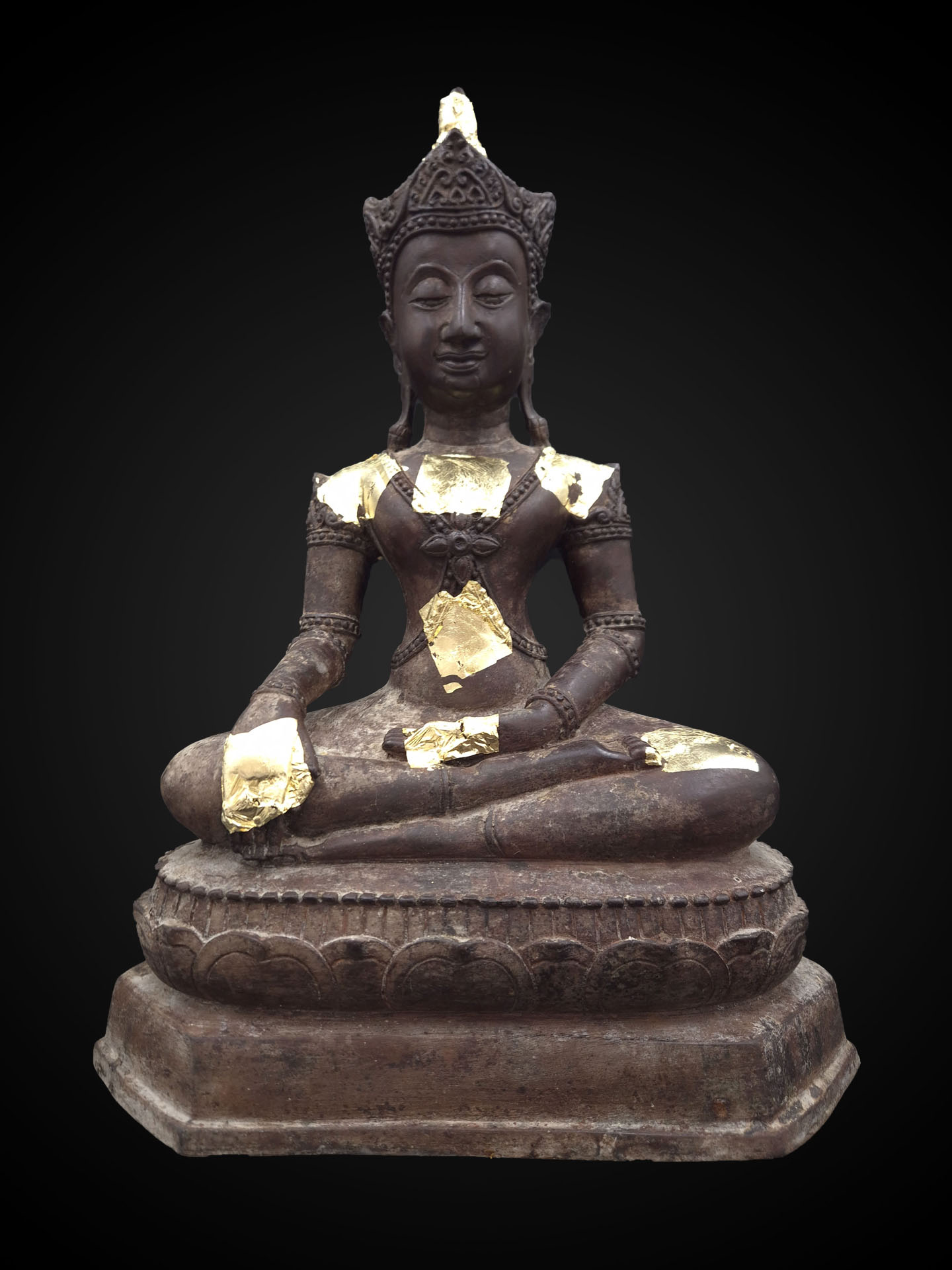 Khmer Bronze Crowned Earth-Touching Buddha Statue with Applied Gold Leaf – 39 cm