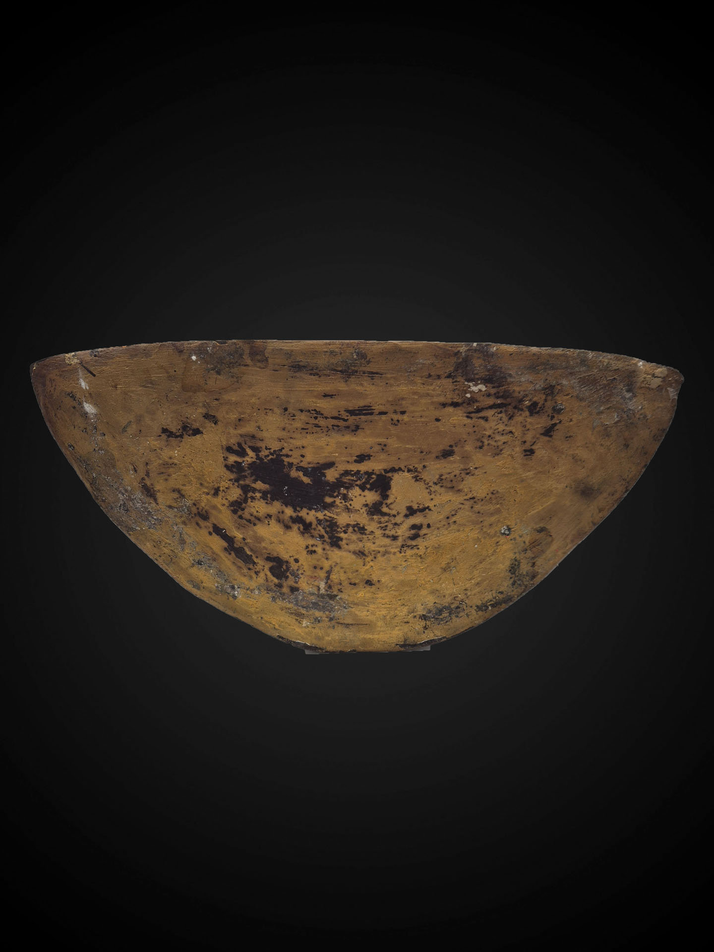 Distinctive elements — including the tapered crown, textured head surface, and geometric base with triangular panel motifs — express the stylistic vocabulary of this lineage. The proportions emphasize stability and presence, giving the figure a composed and authoritative character.
