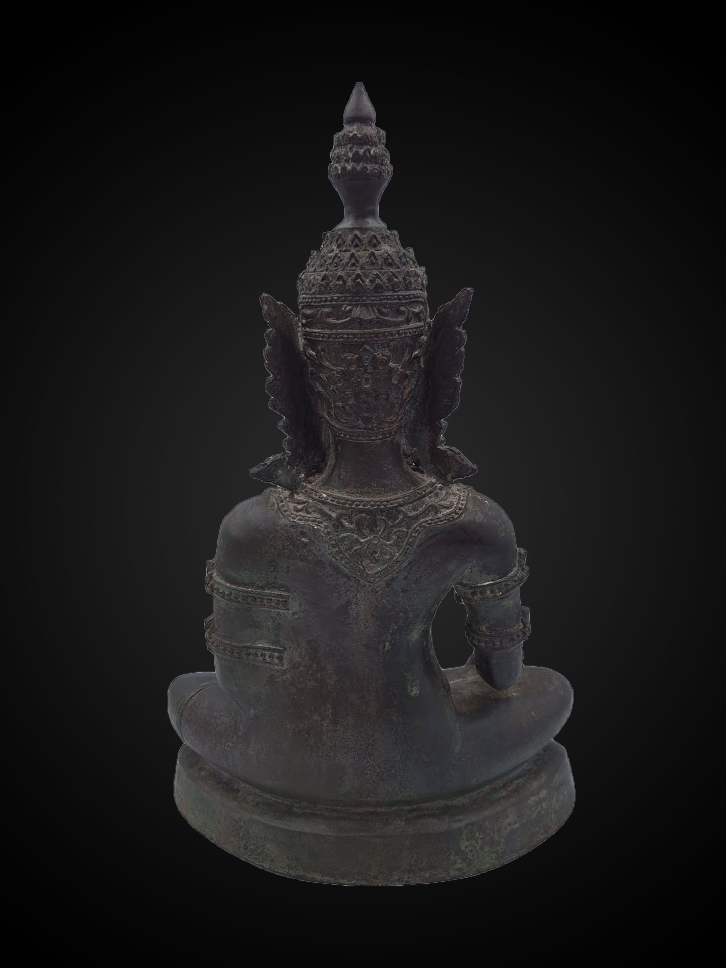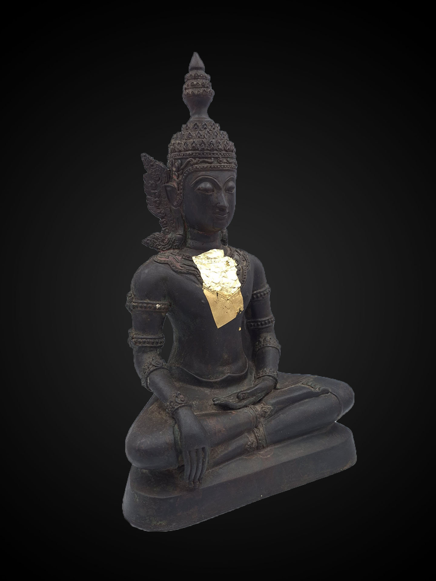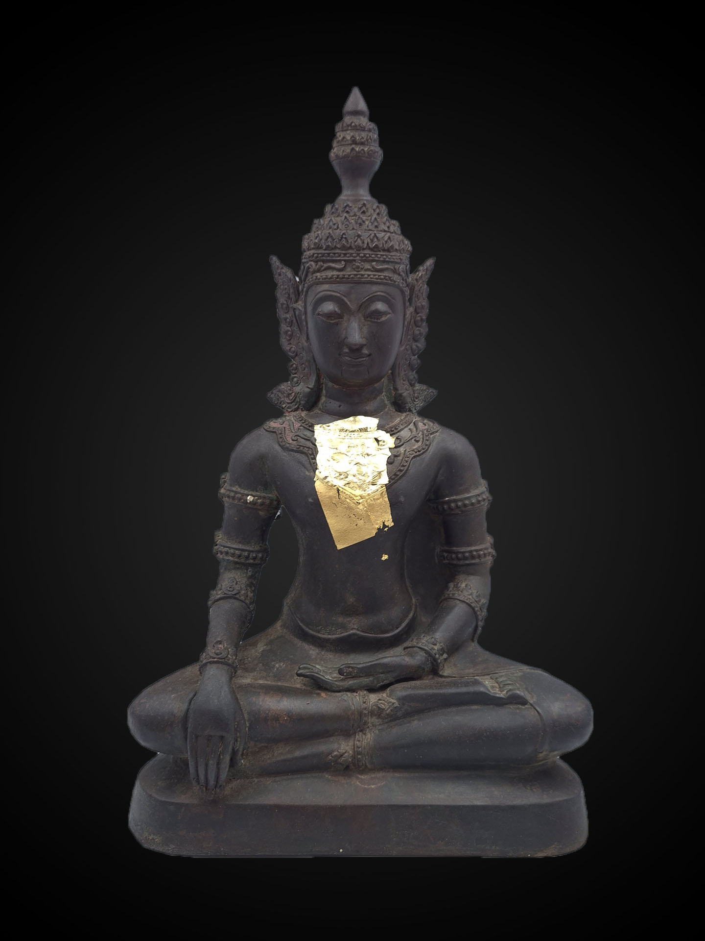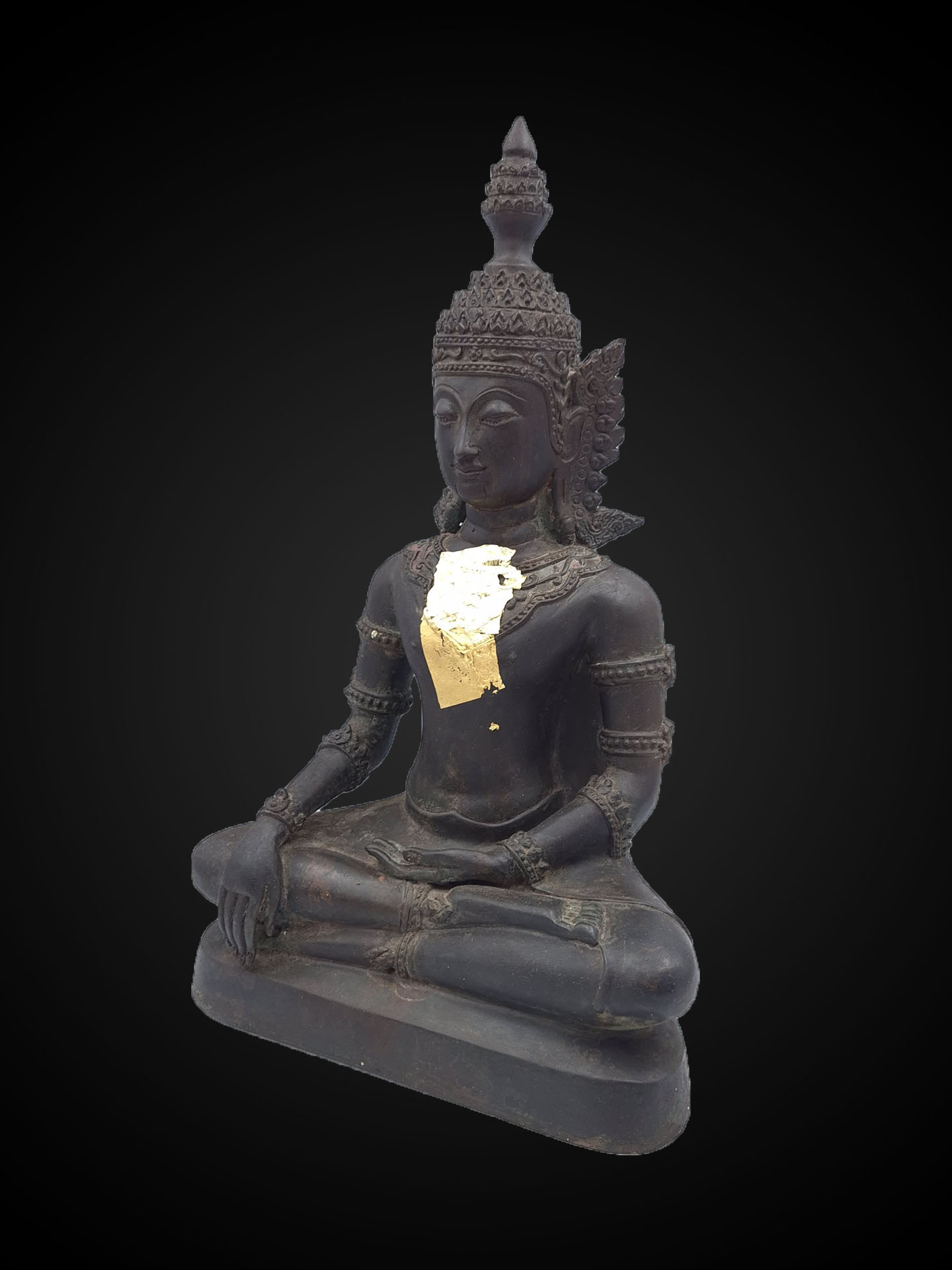 Distinctive elements — including the tiered royal crown, elongated ear ornaments, and subtle chest adornment — express the stylistic vocabulary of crowned Buddha imagery. In Southeast Asian Buddhist art, the crown symbolises the Buddha’s spiritual sovereignty, representing enlightenment as the highest form of kingship.