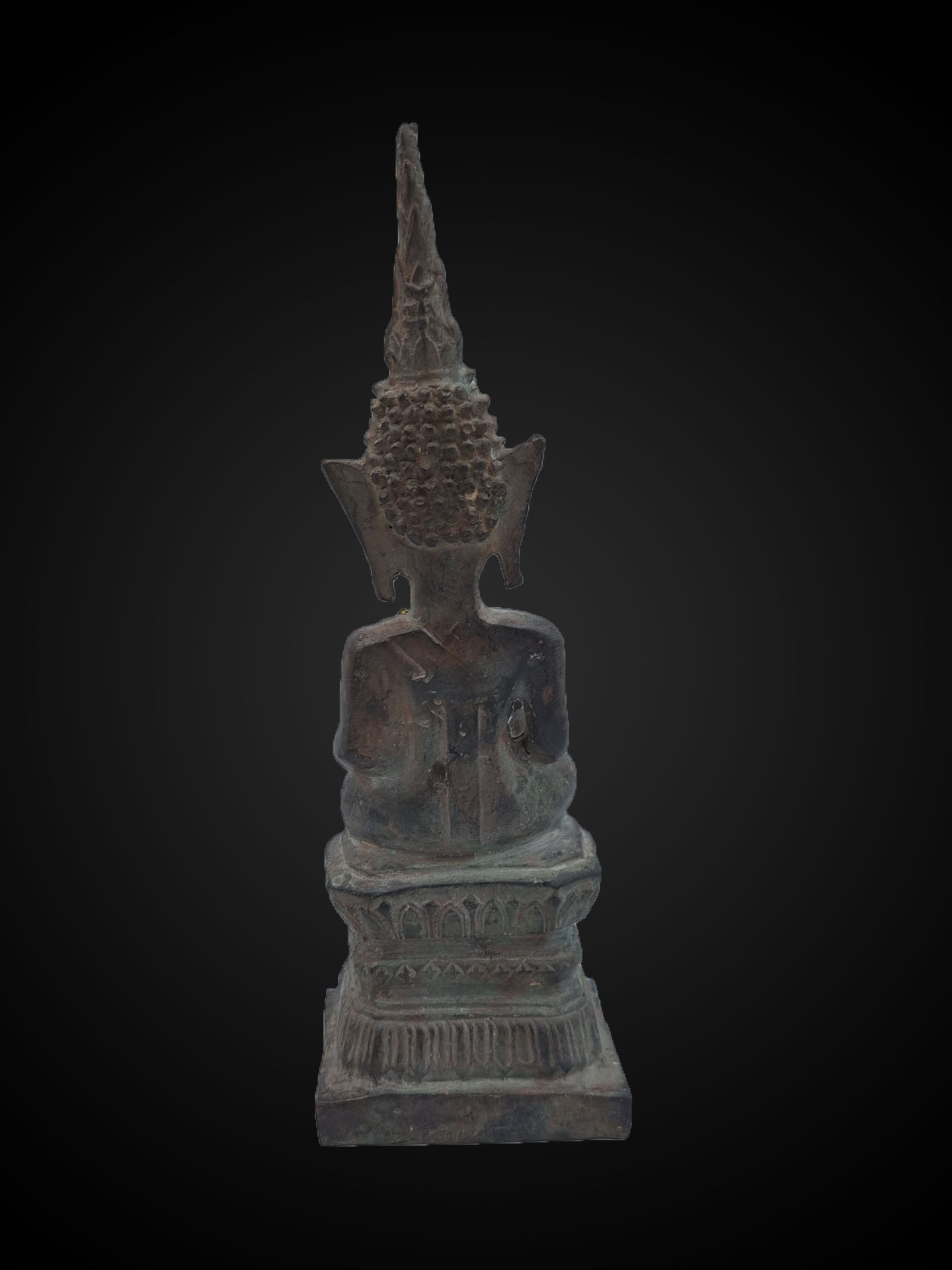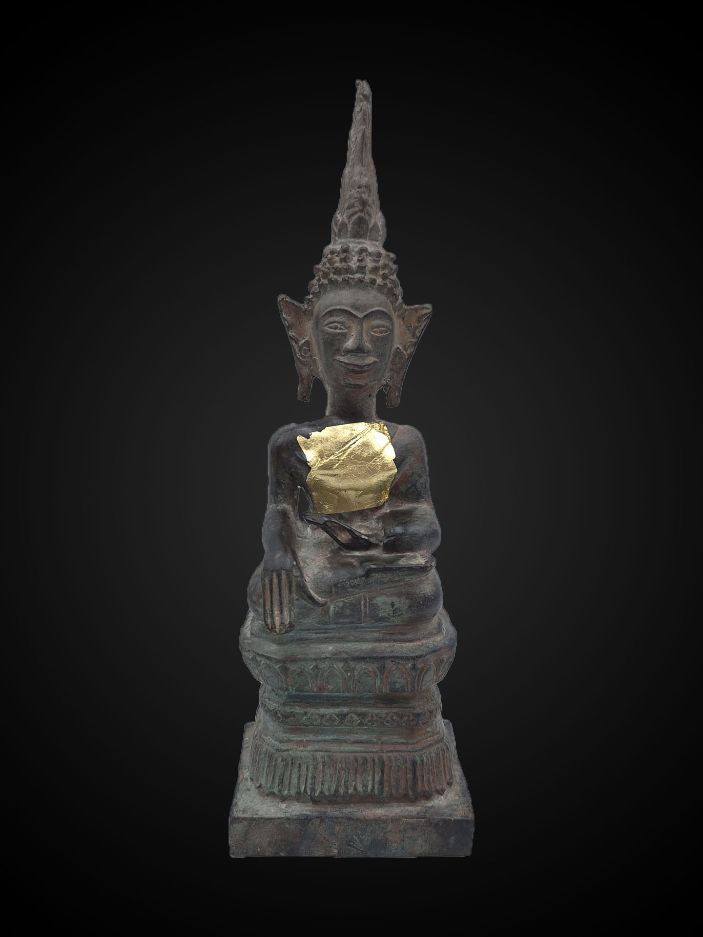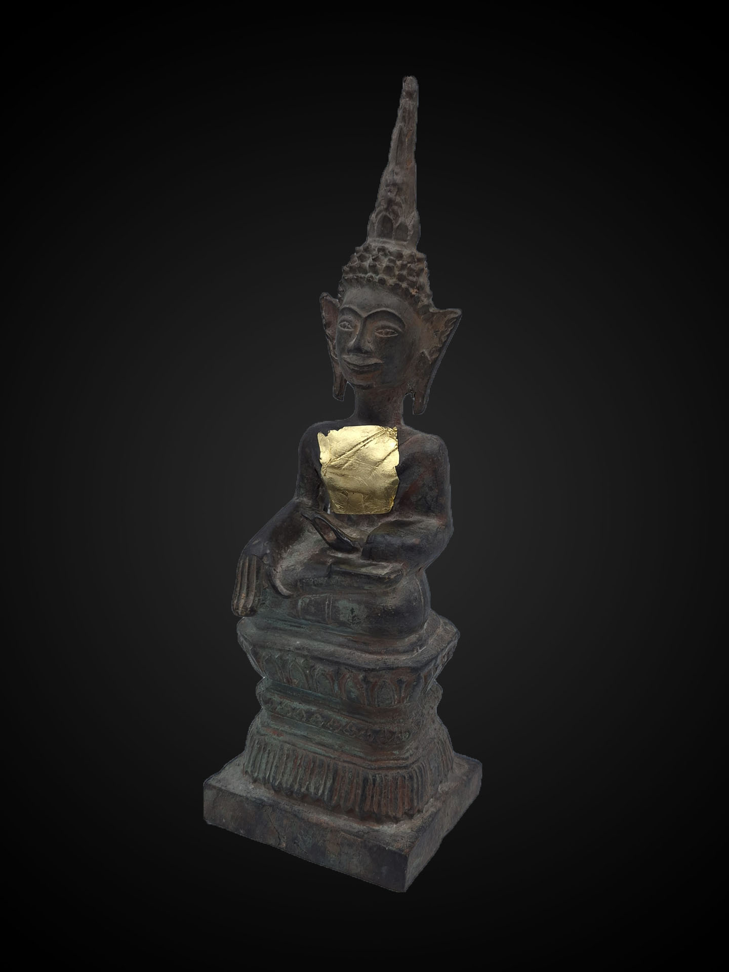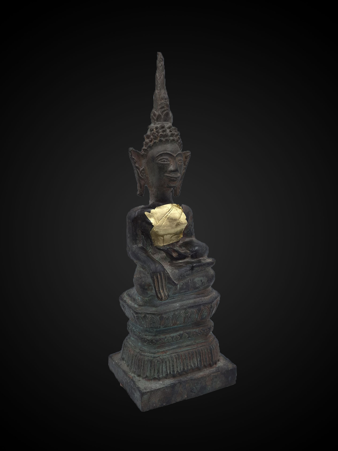 Distinctive elements — including the tall flame-shaped finial, gently smiling expression, and slender seated form — express the stylistic vocabulary of this lineage. The figure rests upon a tiered lotus pedestal with repeating decorative motifs, reinforcing the regional aesthetic often seen in northern Tai Buddhist sculpture.