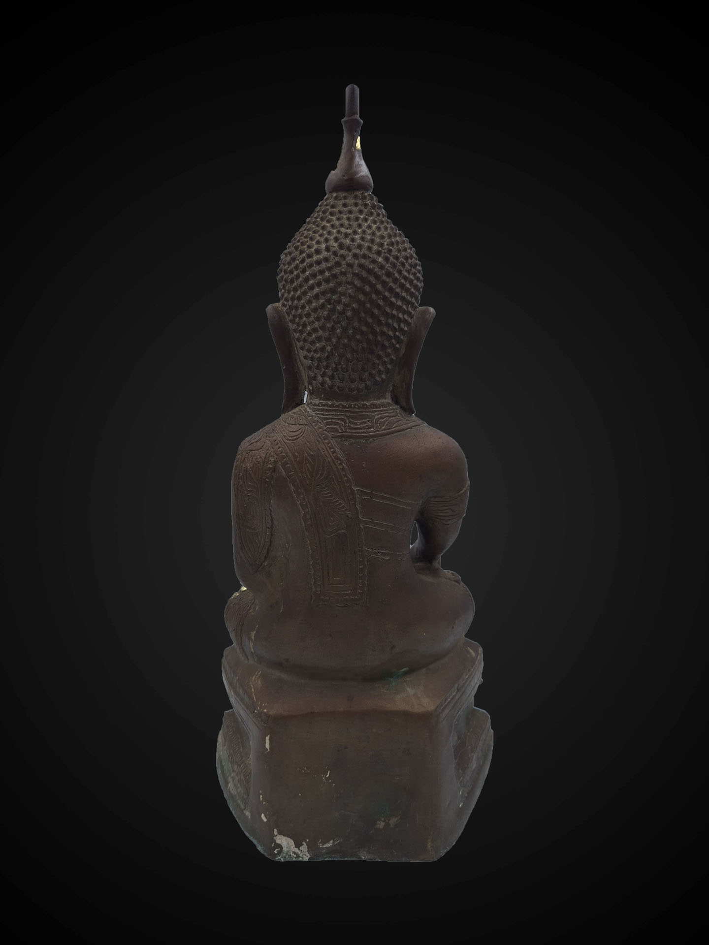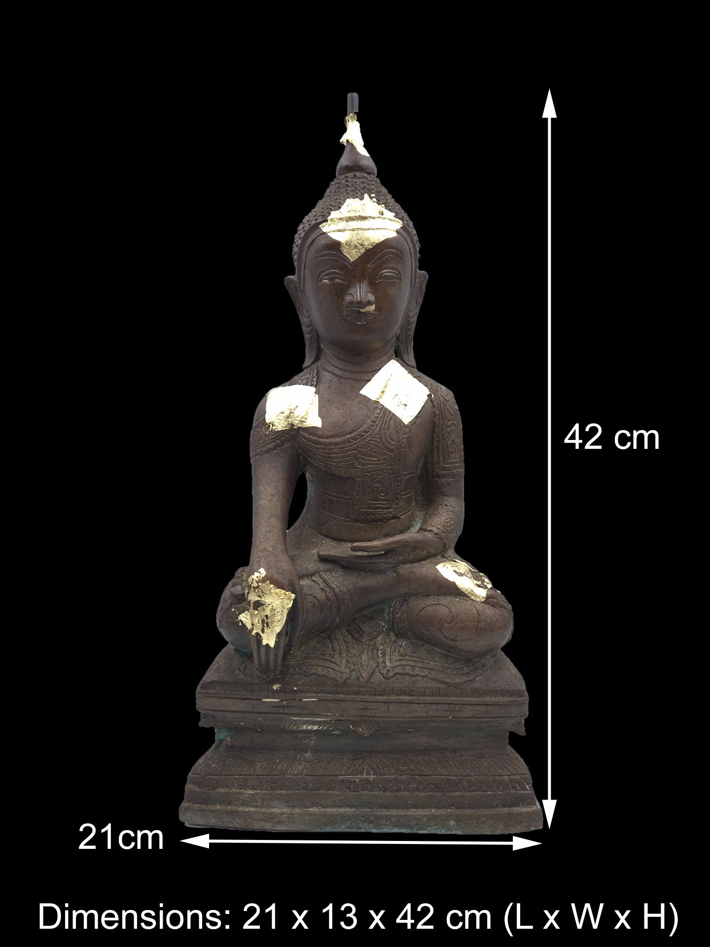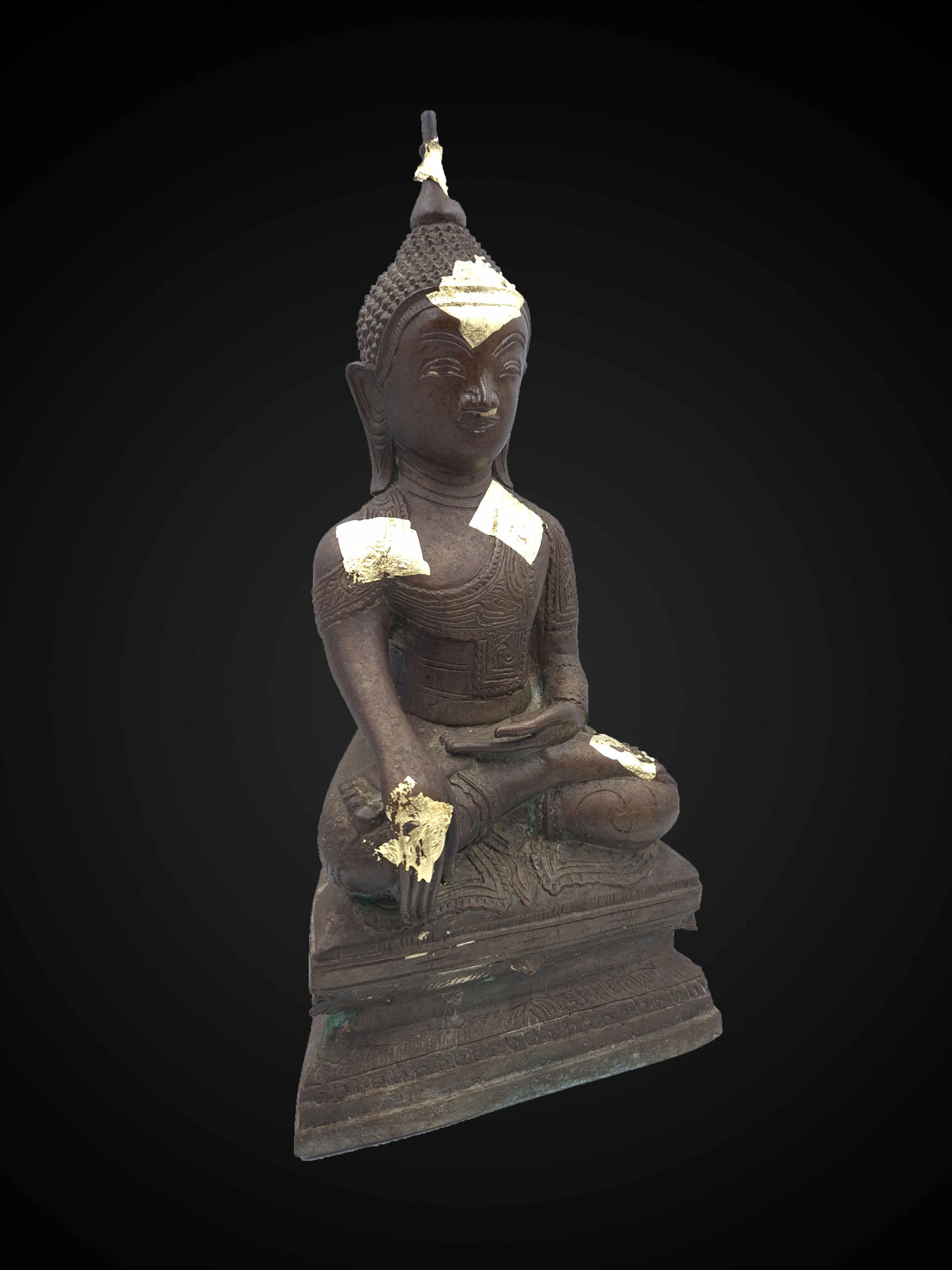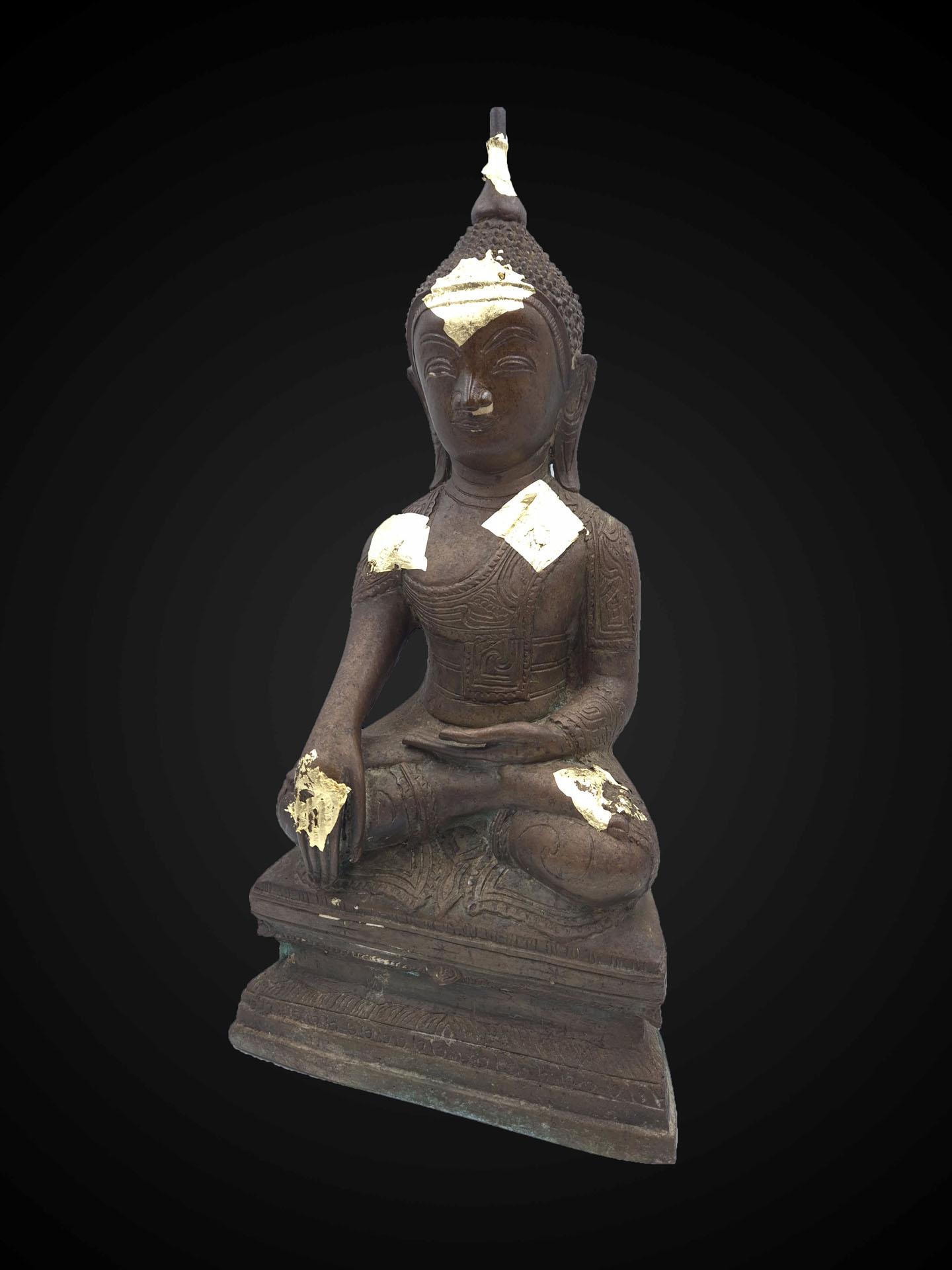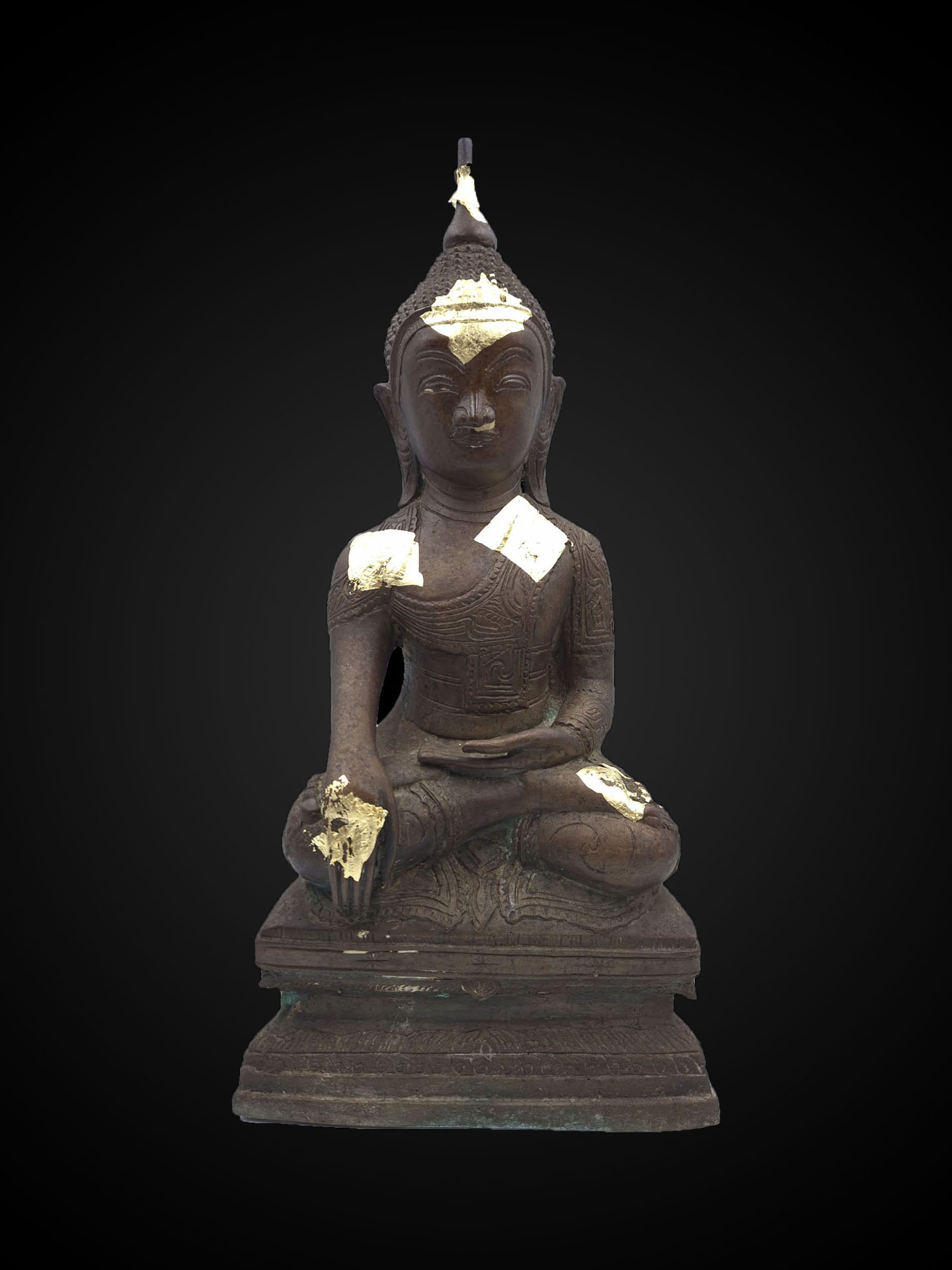 The bronze surface displays a developed patina with devotional traces of applied gold leaf, giving the sculpture a dignified presence shaped by ritual reverence.