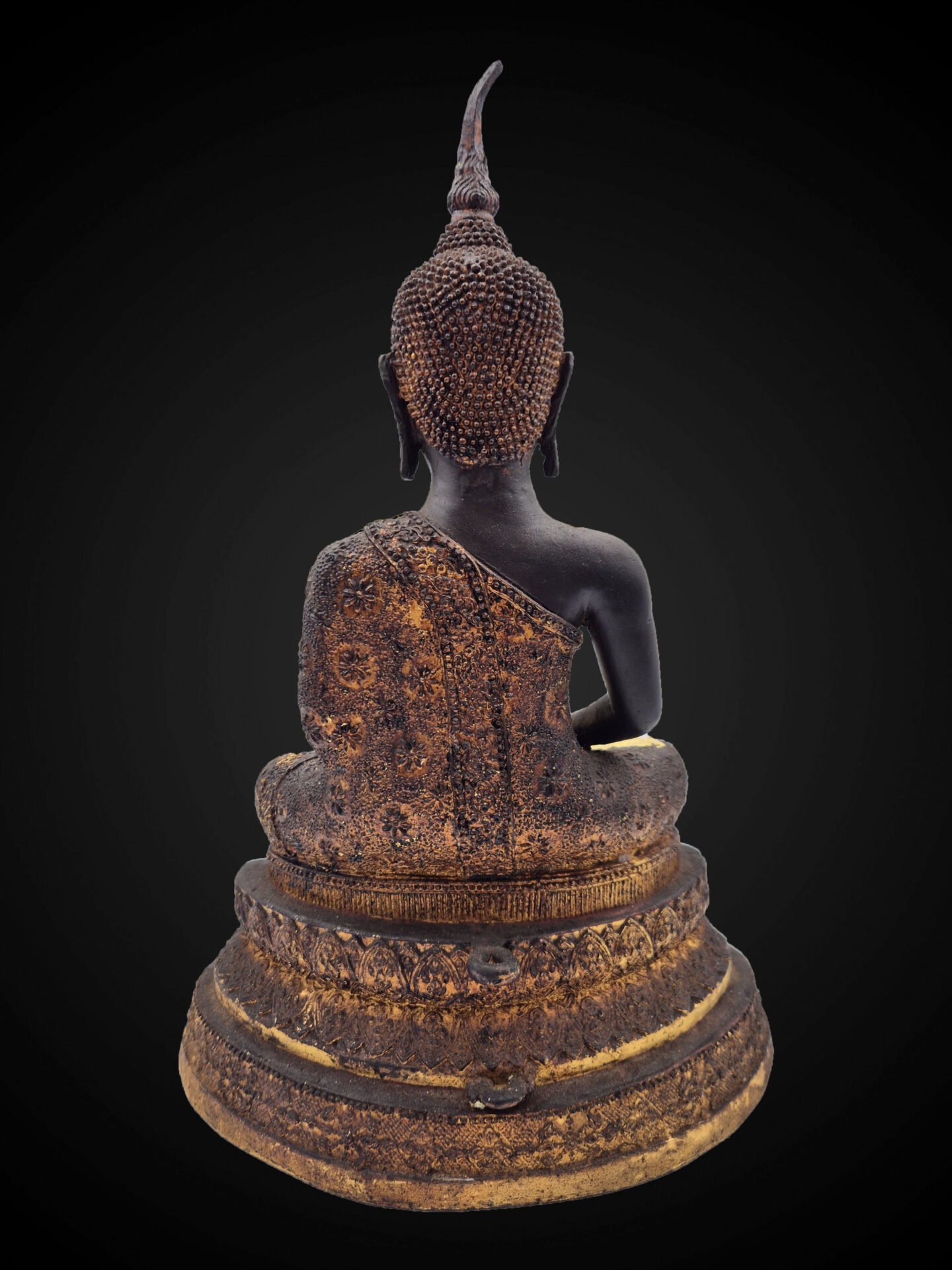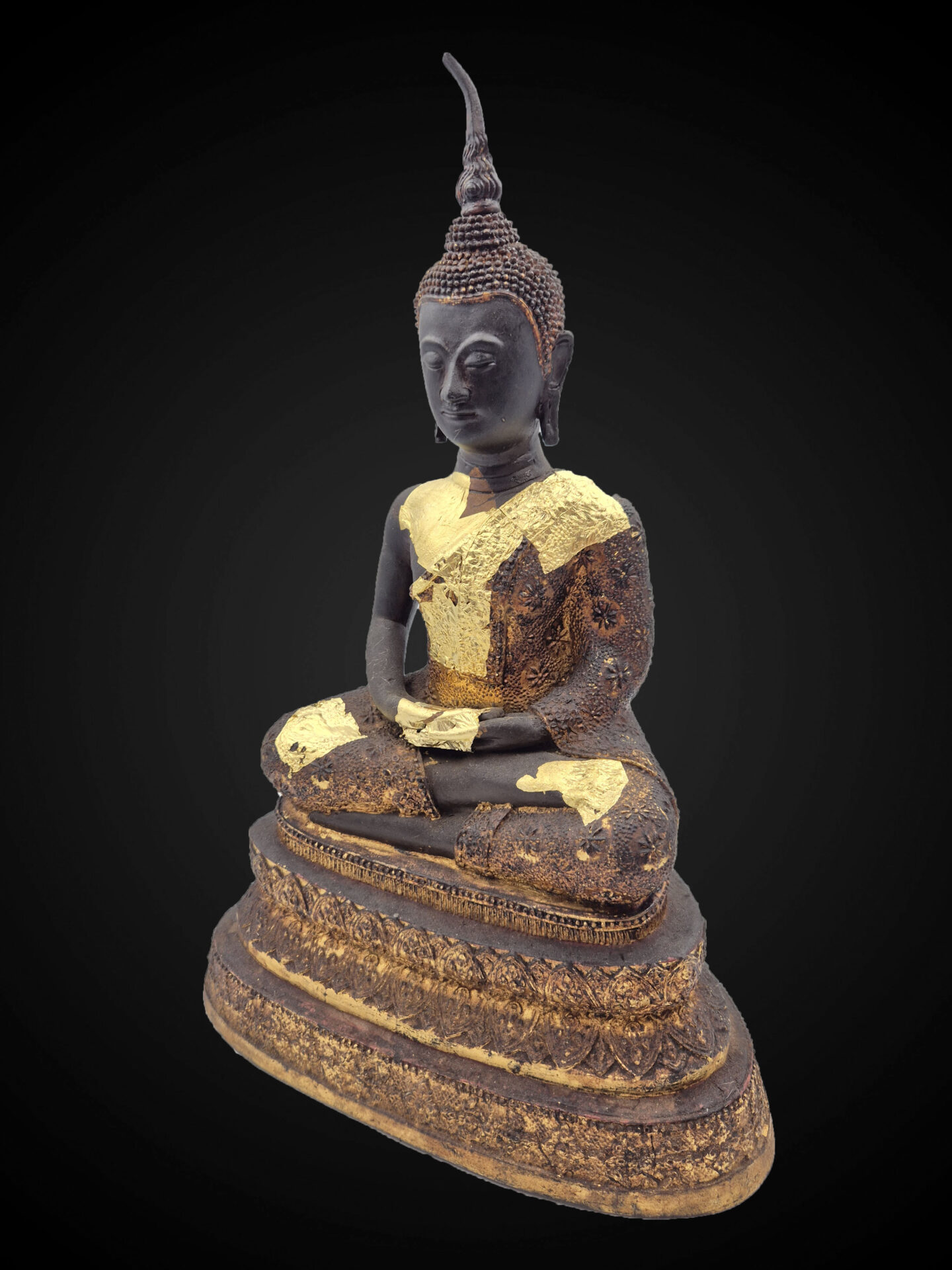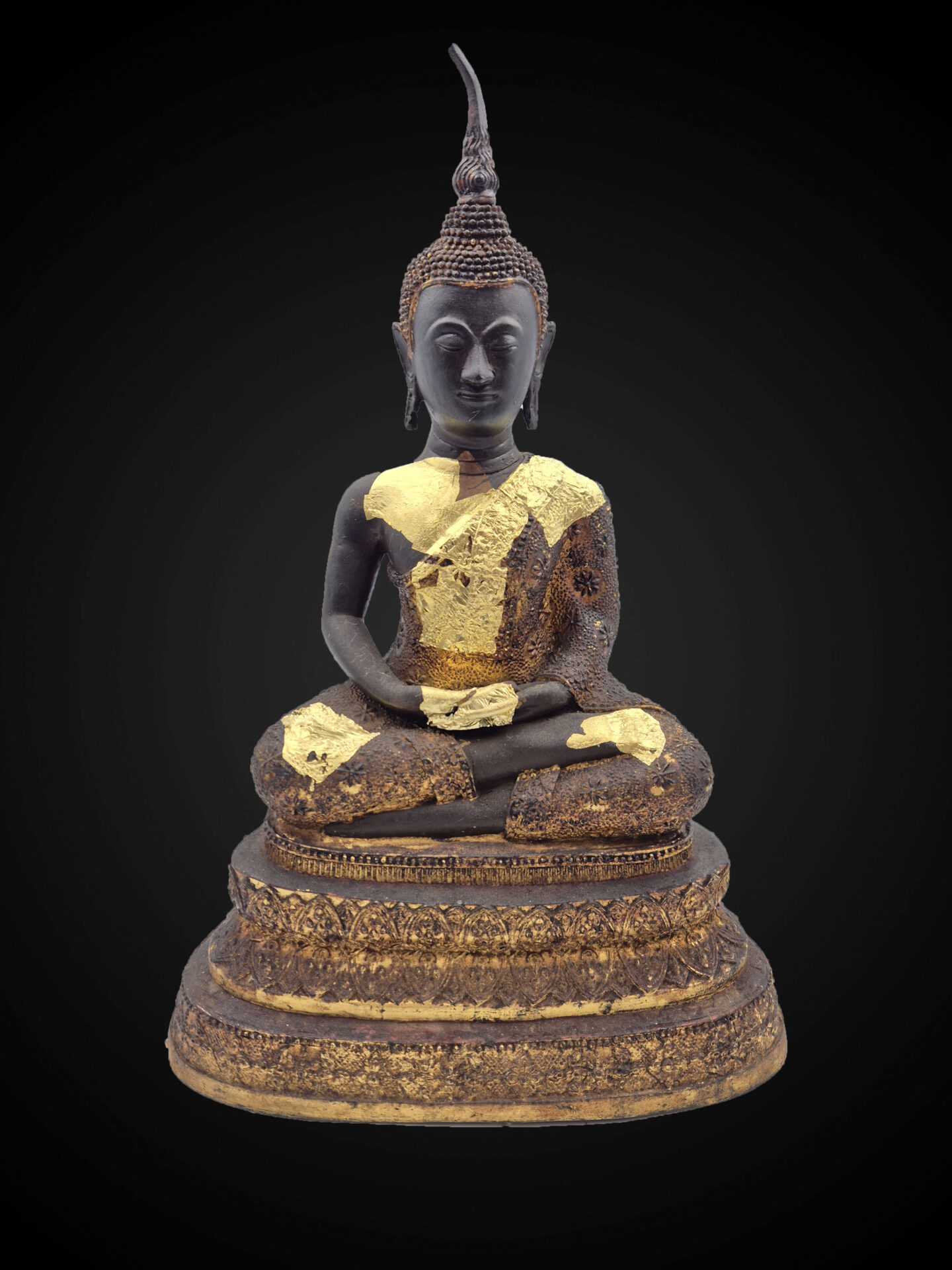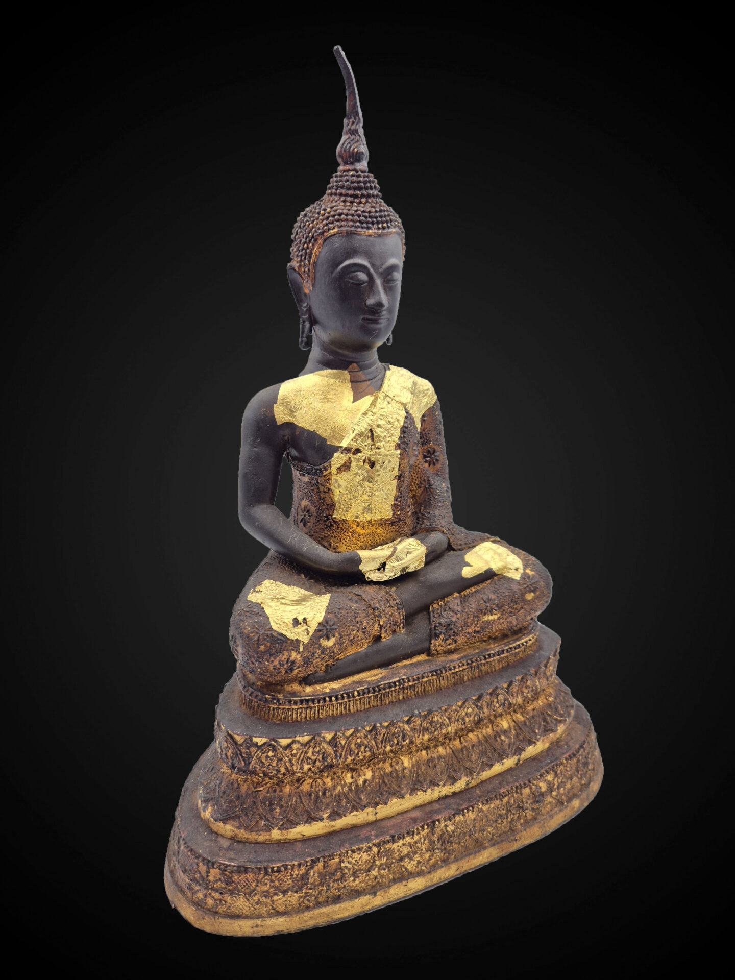 The bronze surface carries a deep, matured patina with natural wear and aged gold leaf remnants, reflecting devotional use over time and contributing to its overall character.