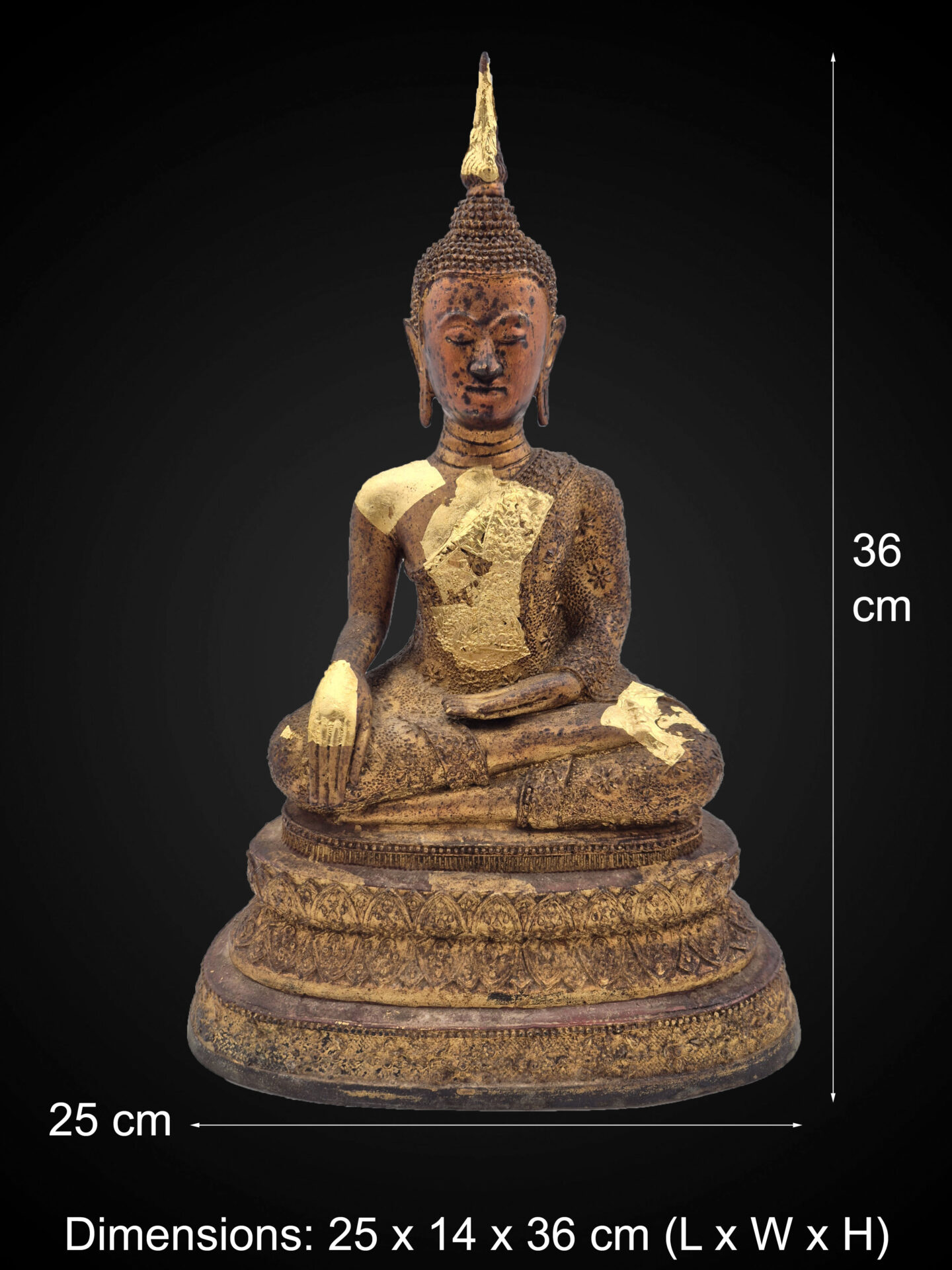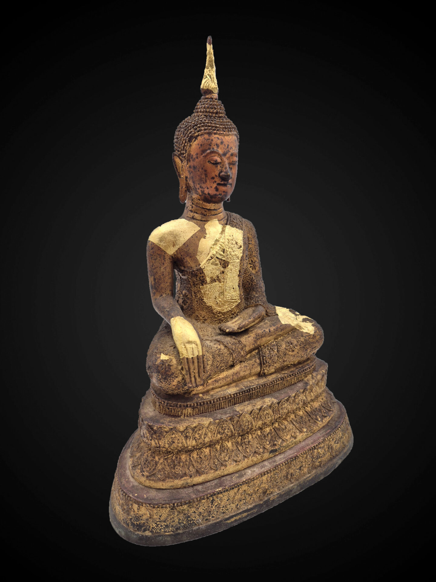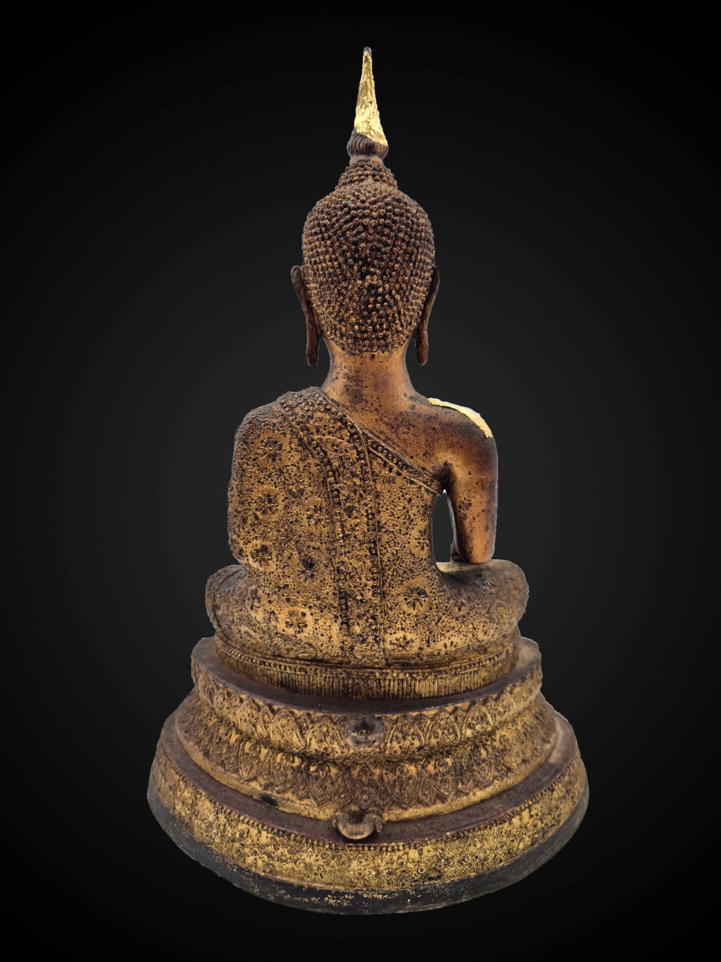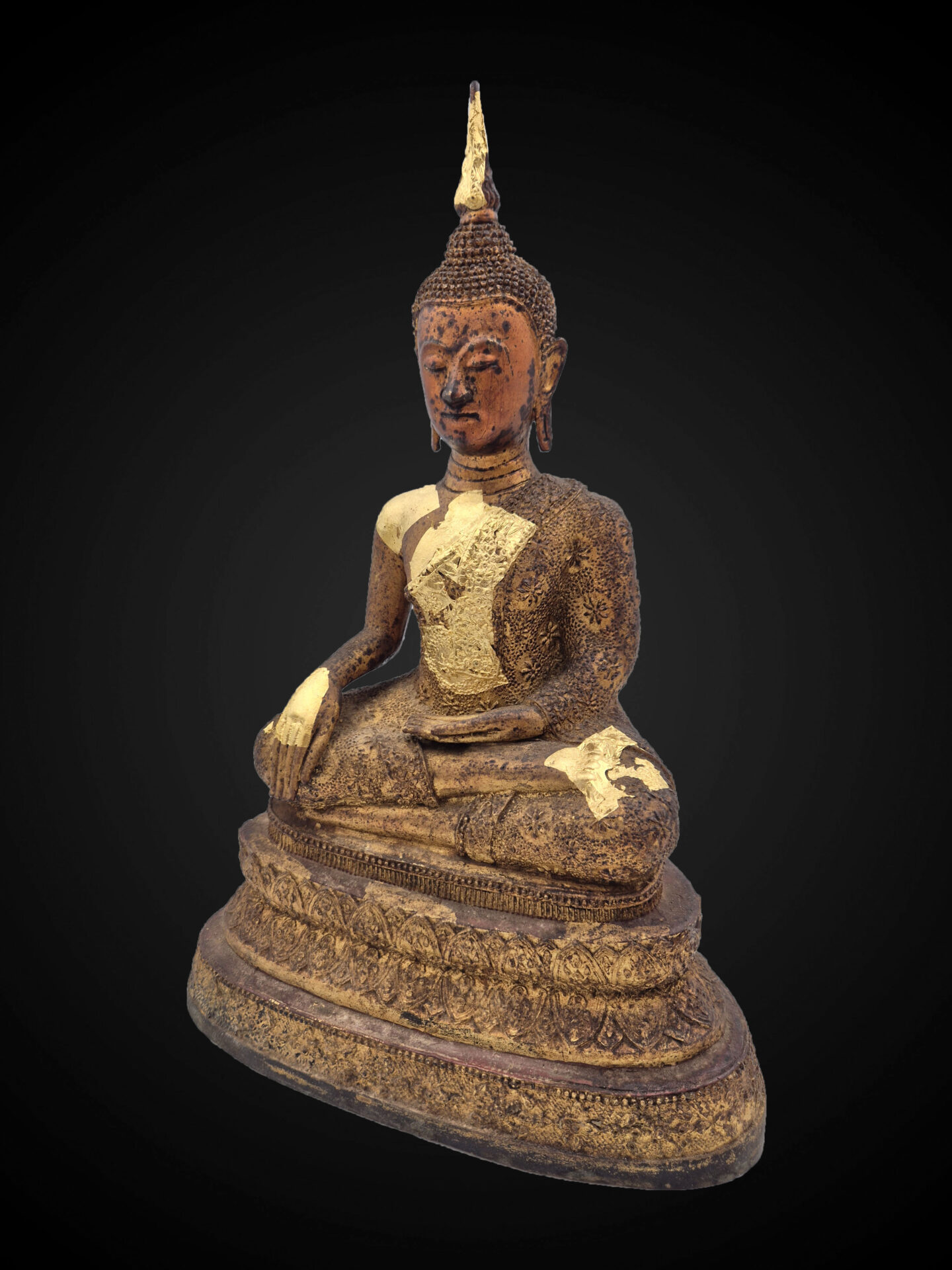 The surface shows a rich aged bronze patina, complemented by remnants of gold leaf application across the robe and upper body, indicating devotional use over time and enhancing its visual character.