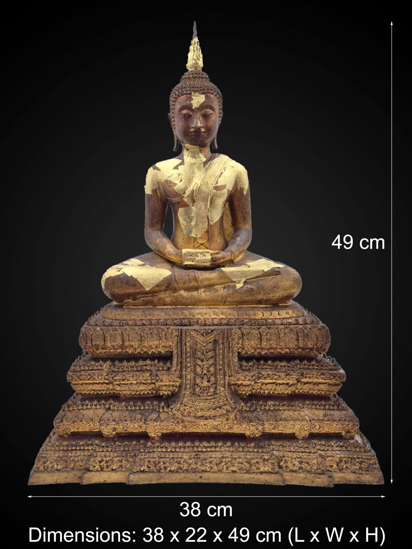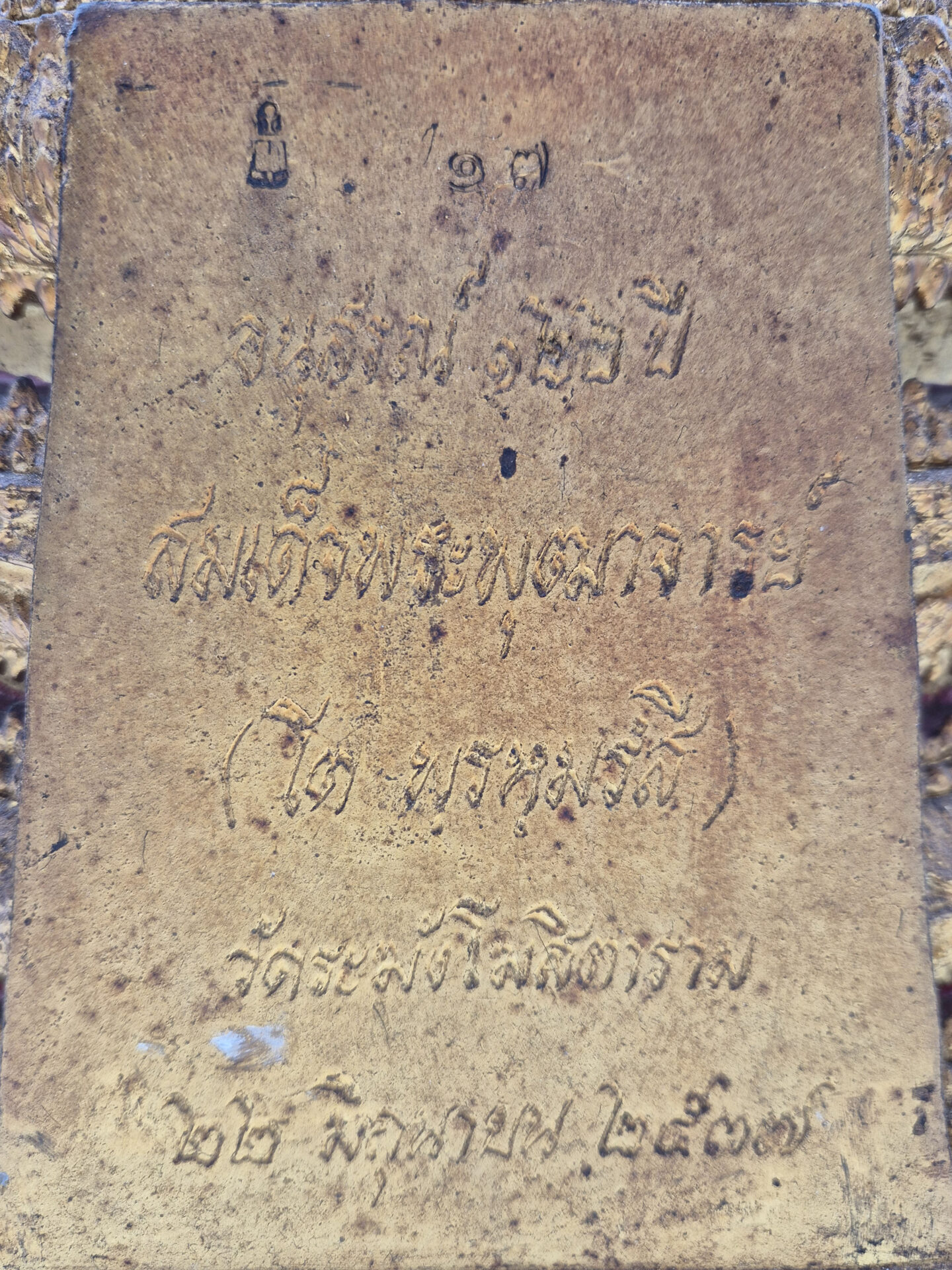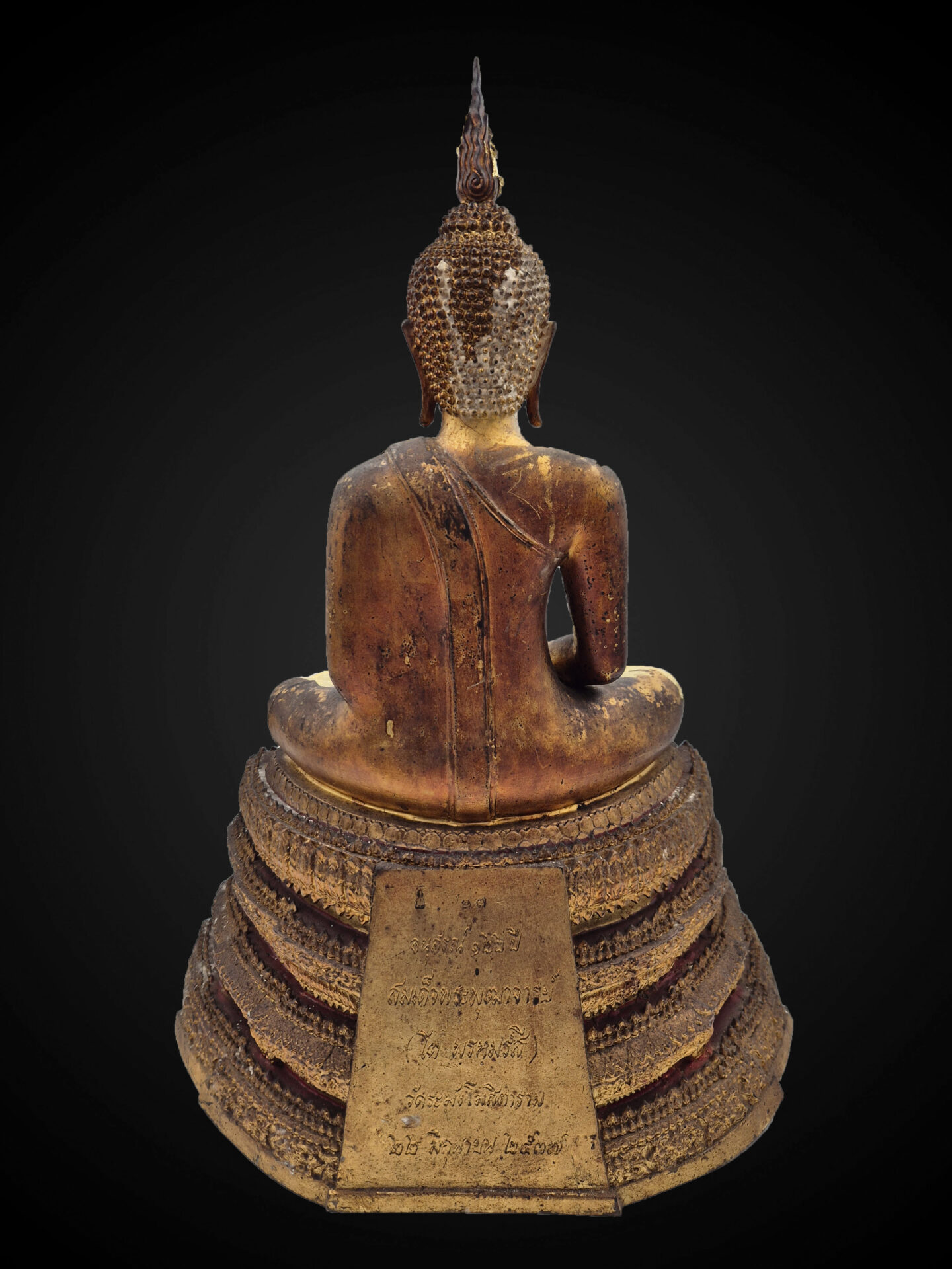 An inscription plate affixed to the base references Wat Rakhang, Bangkok, providing context to its temple-associated origin.