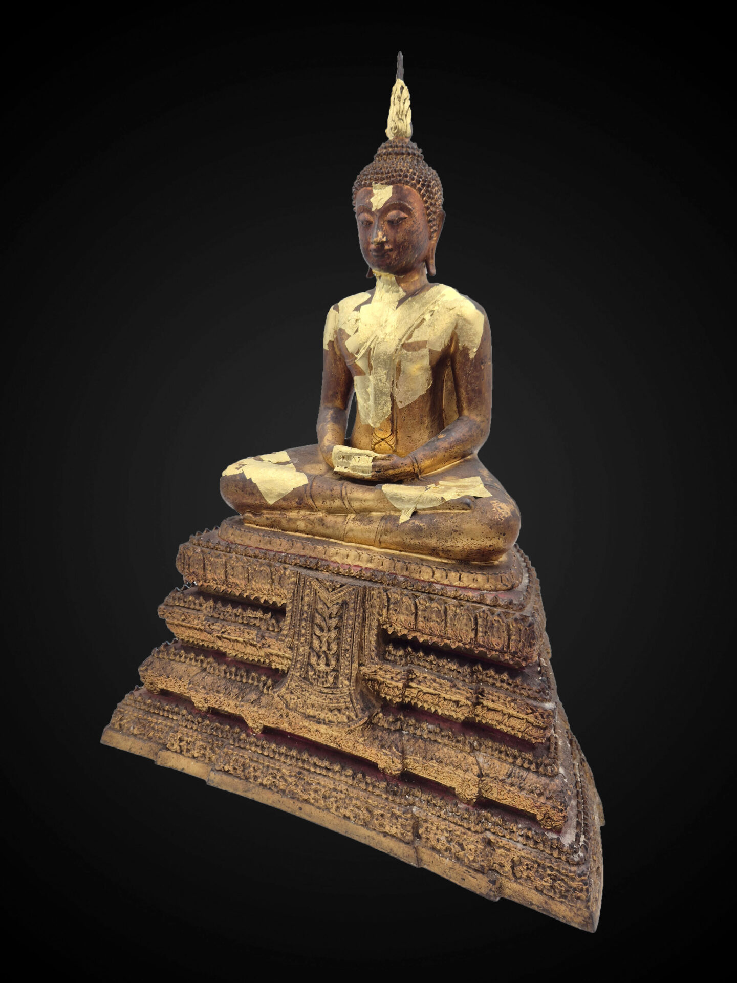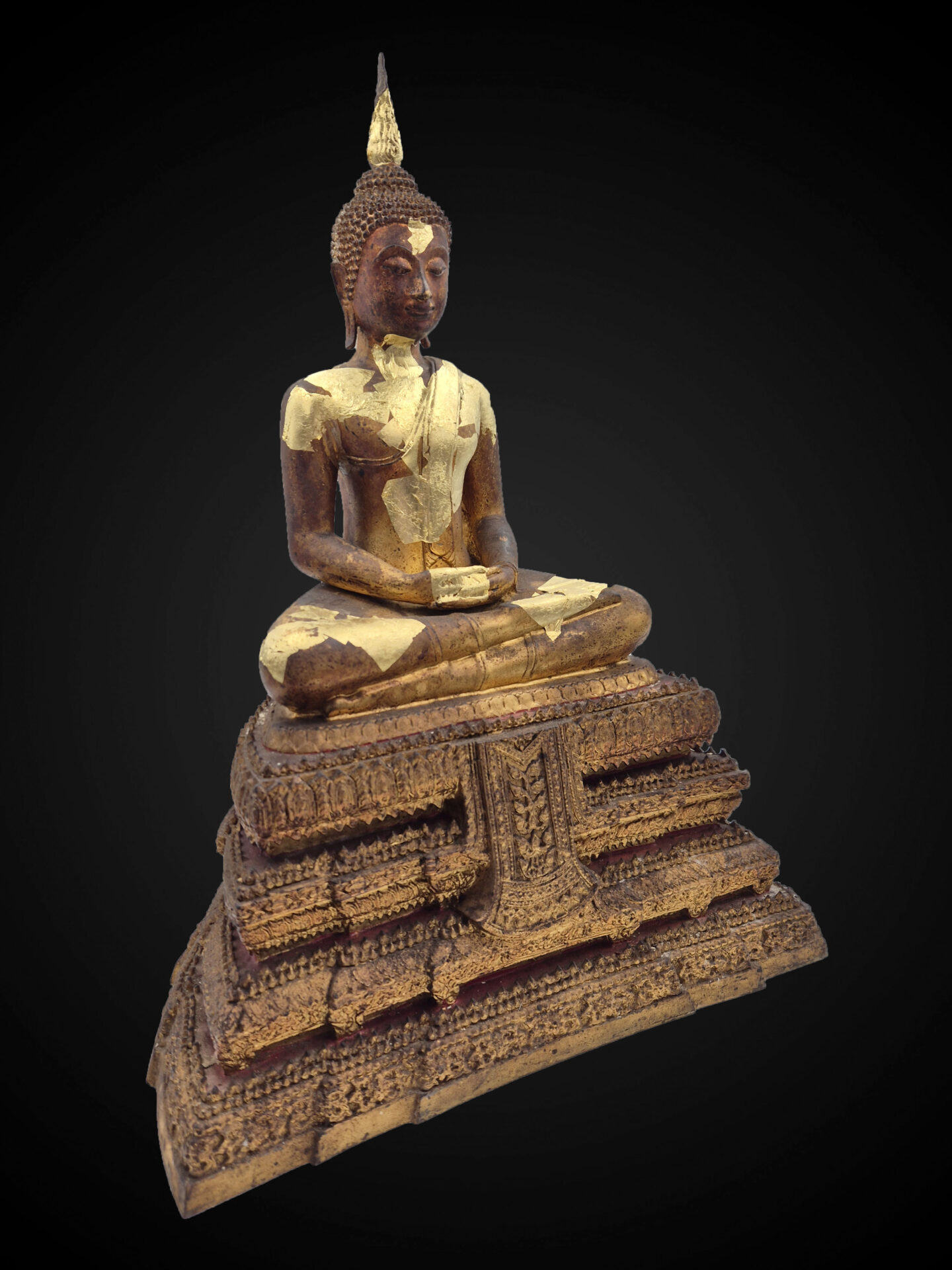 Distinctive elements — including the calm facial expression, compact seated form, and tall flame-like ushnisha — express the stylistic vocabulary of this lineage. The multi-tiered base, richly decorated with ornamental bands and traditional layered detailing, reinforces its temple-oriented presentation.