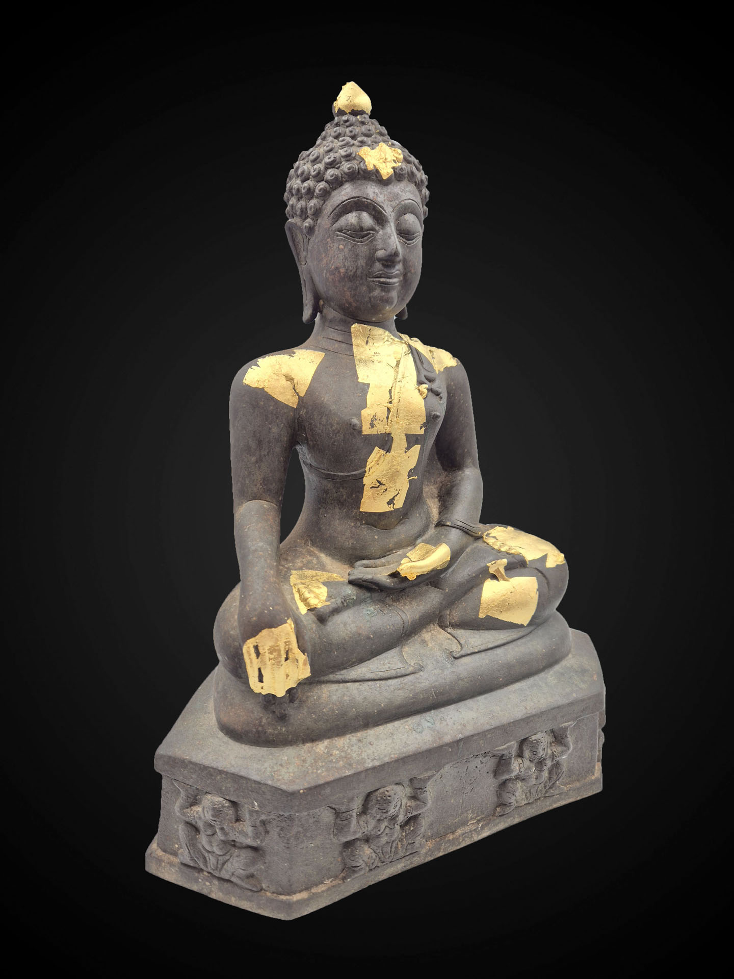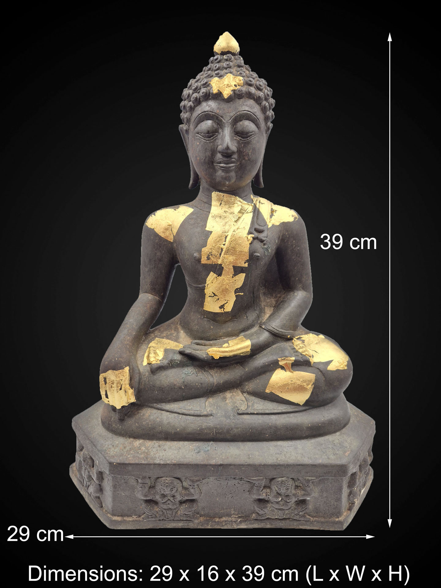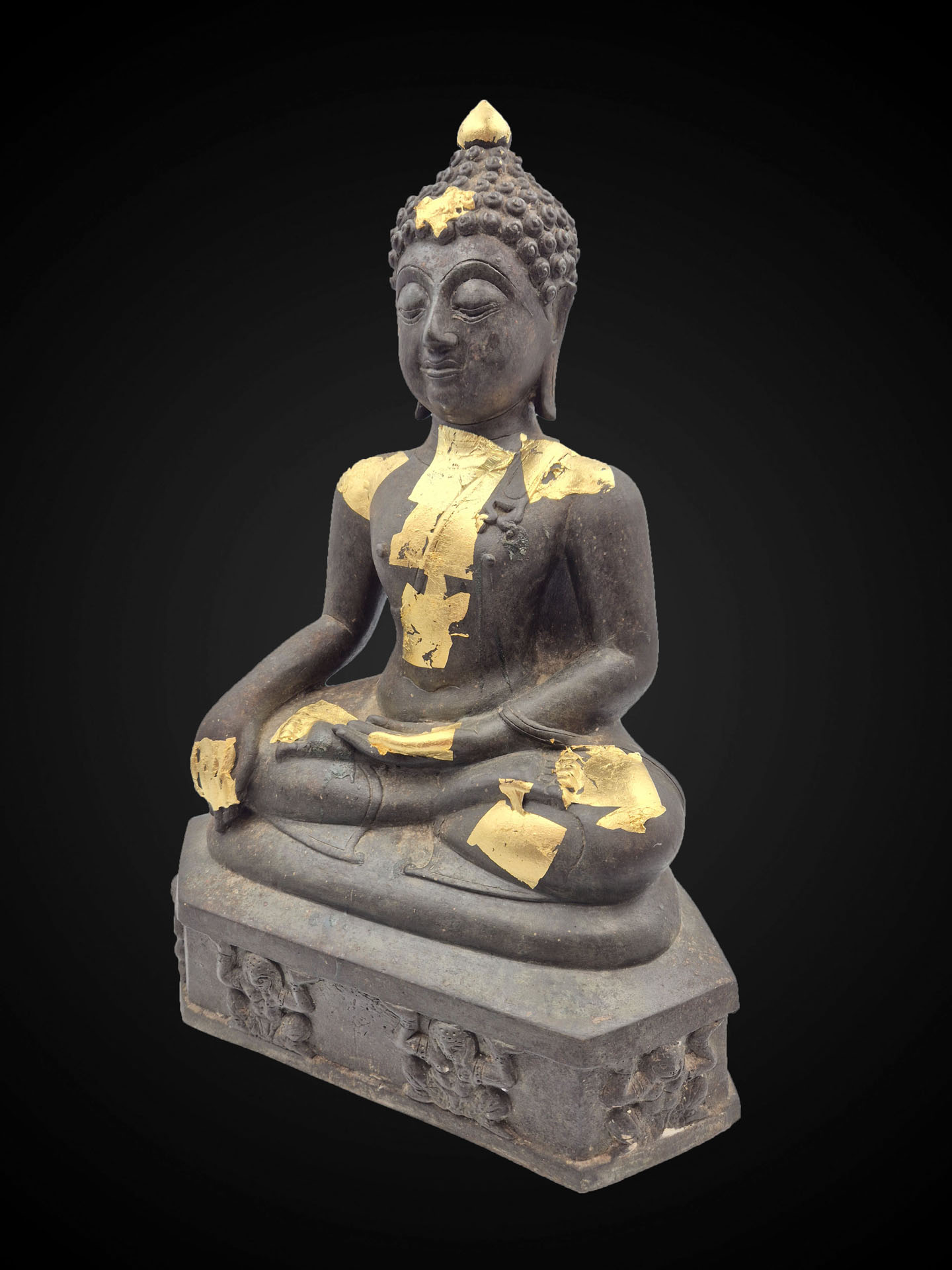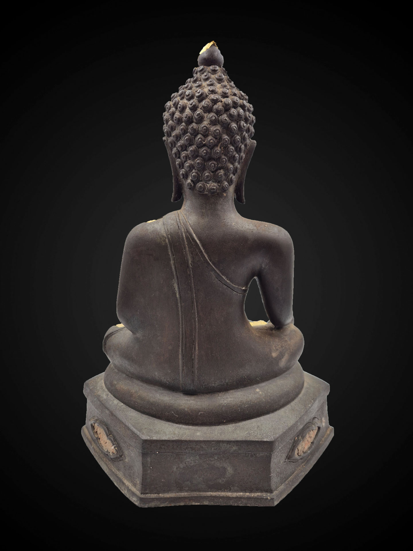 The sculpture reflects a regional Southeast Asian interpretation of the Buddha form, distinguished by its fuller facial features, grounded proportions, and more expressive handcrafted character. Unlike the refined court styles of Central Thailand, this piece embodies a more earthy and devotional aesthetic, often associated with temple-cast works across the broader mainland Southeast Asian region.