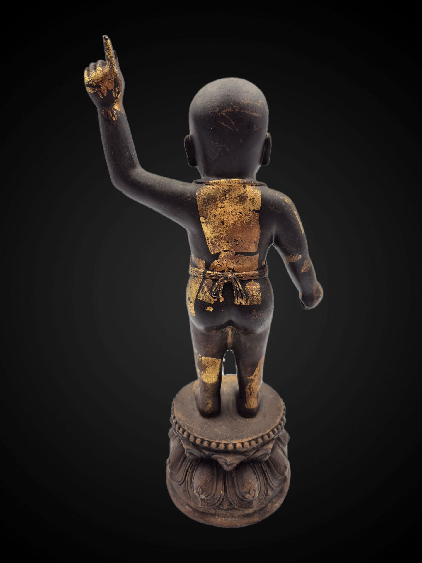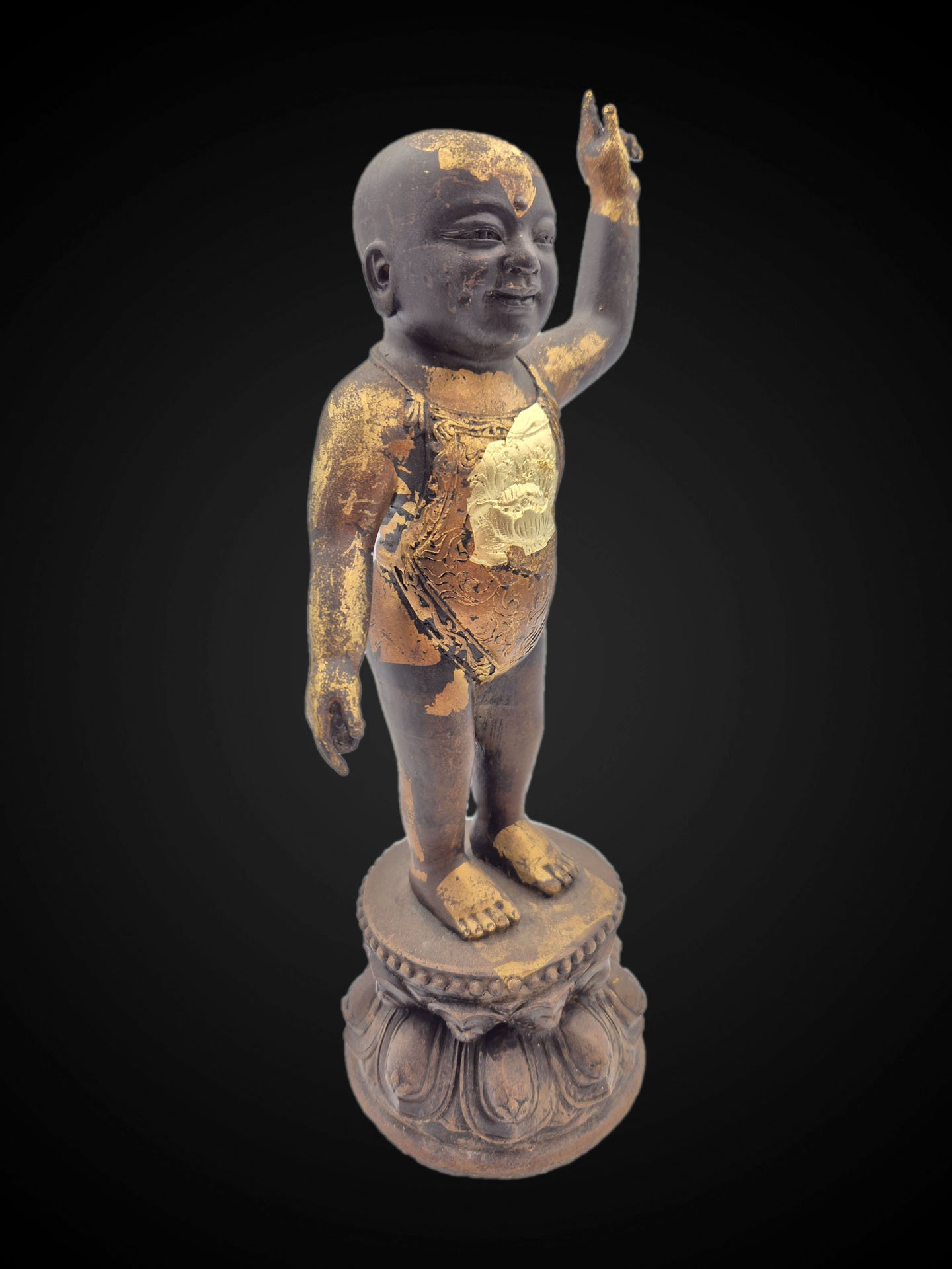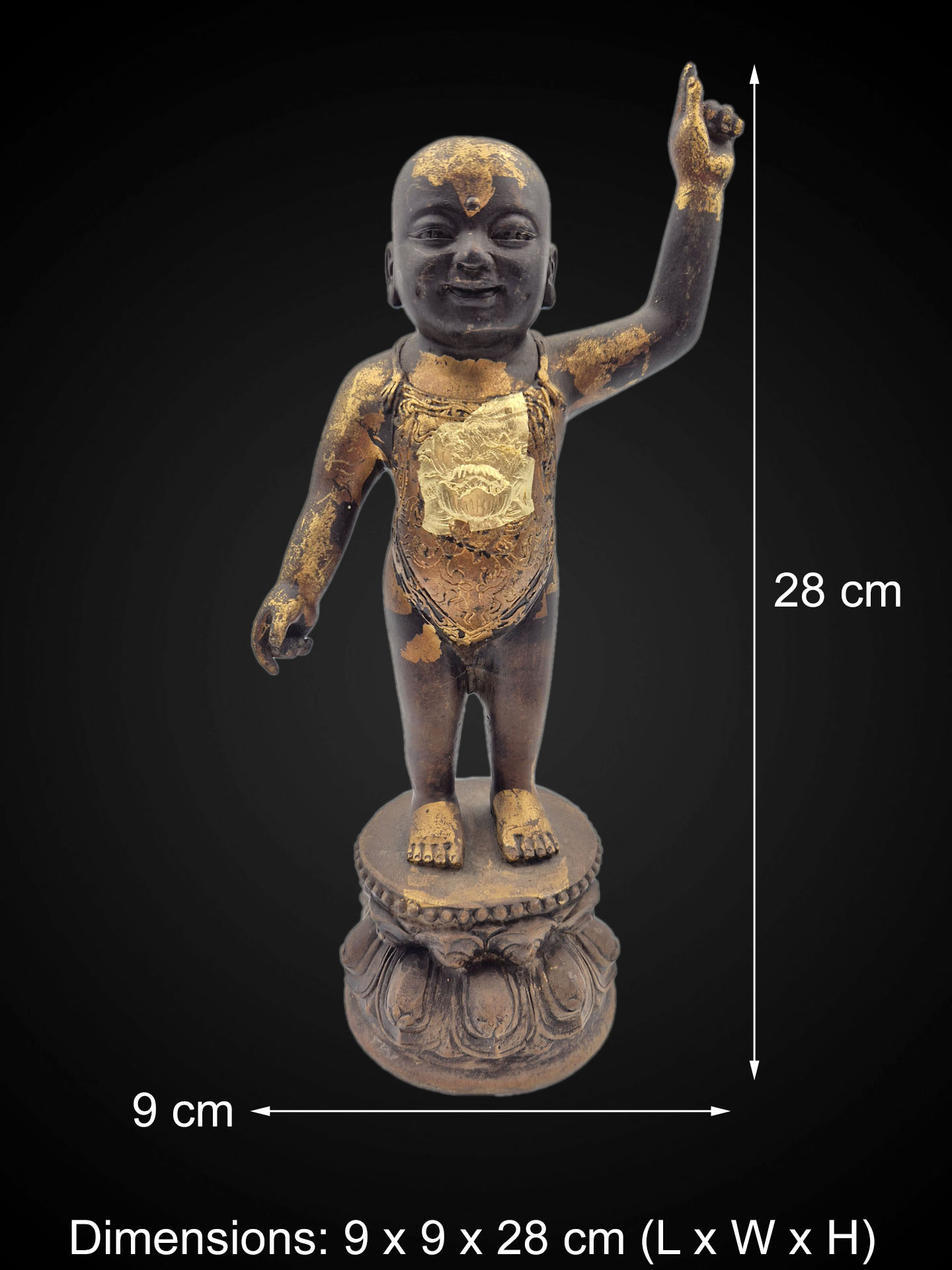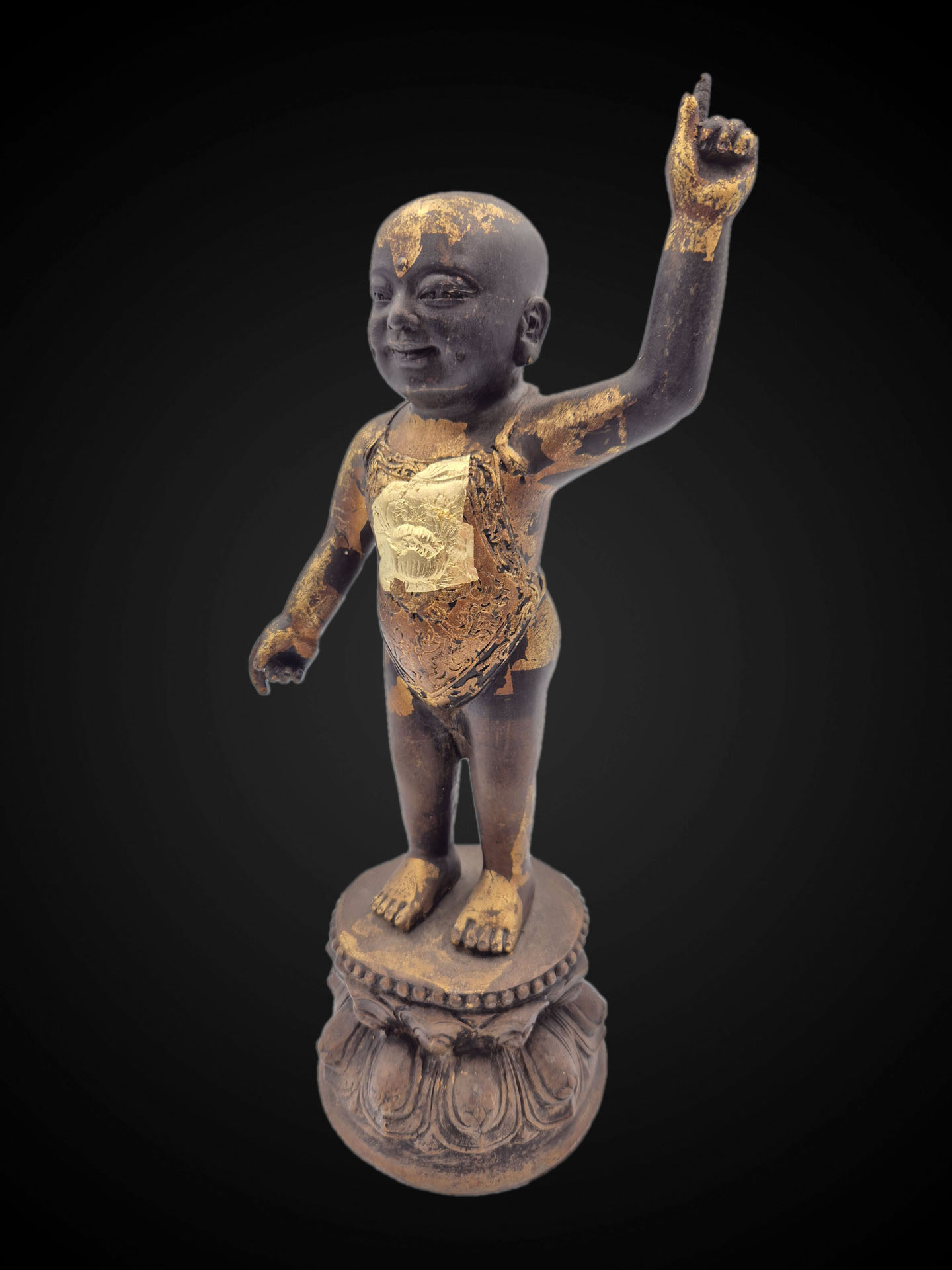 This Thai Baby Buddha (Infant Siddhartha) is depicted in the traditional standing form with one hand raised, symbolizing the moment of the Buddha’s birth and the declaration of spiritual awakening. The gesture represents the transcendence of worldly existence and the path toward enlightenment.