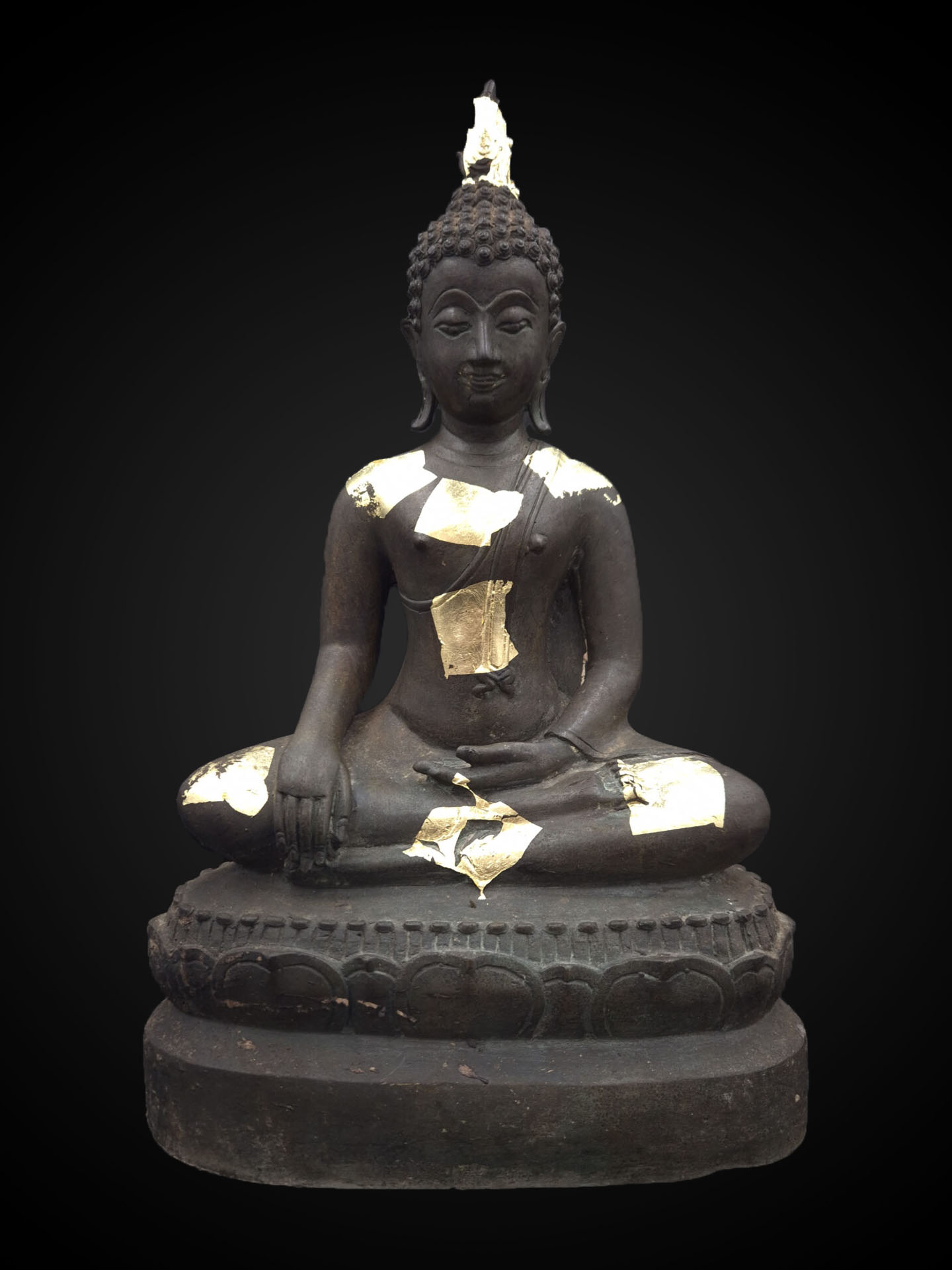 This Thai bronze Buddha is presented in the Earth-Touching (Bhūmisparśa Mudra) posture, symbolising steadfastness and the moment of awakening. The seated composition is balanced and composed, with a serene facial expression and softly defined features.