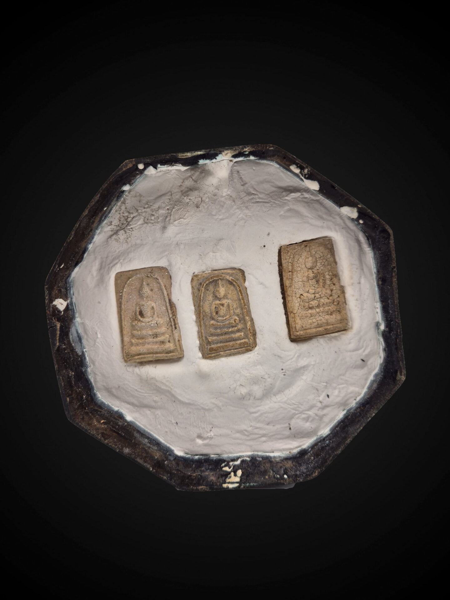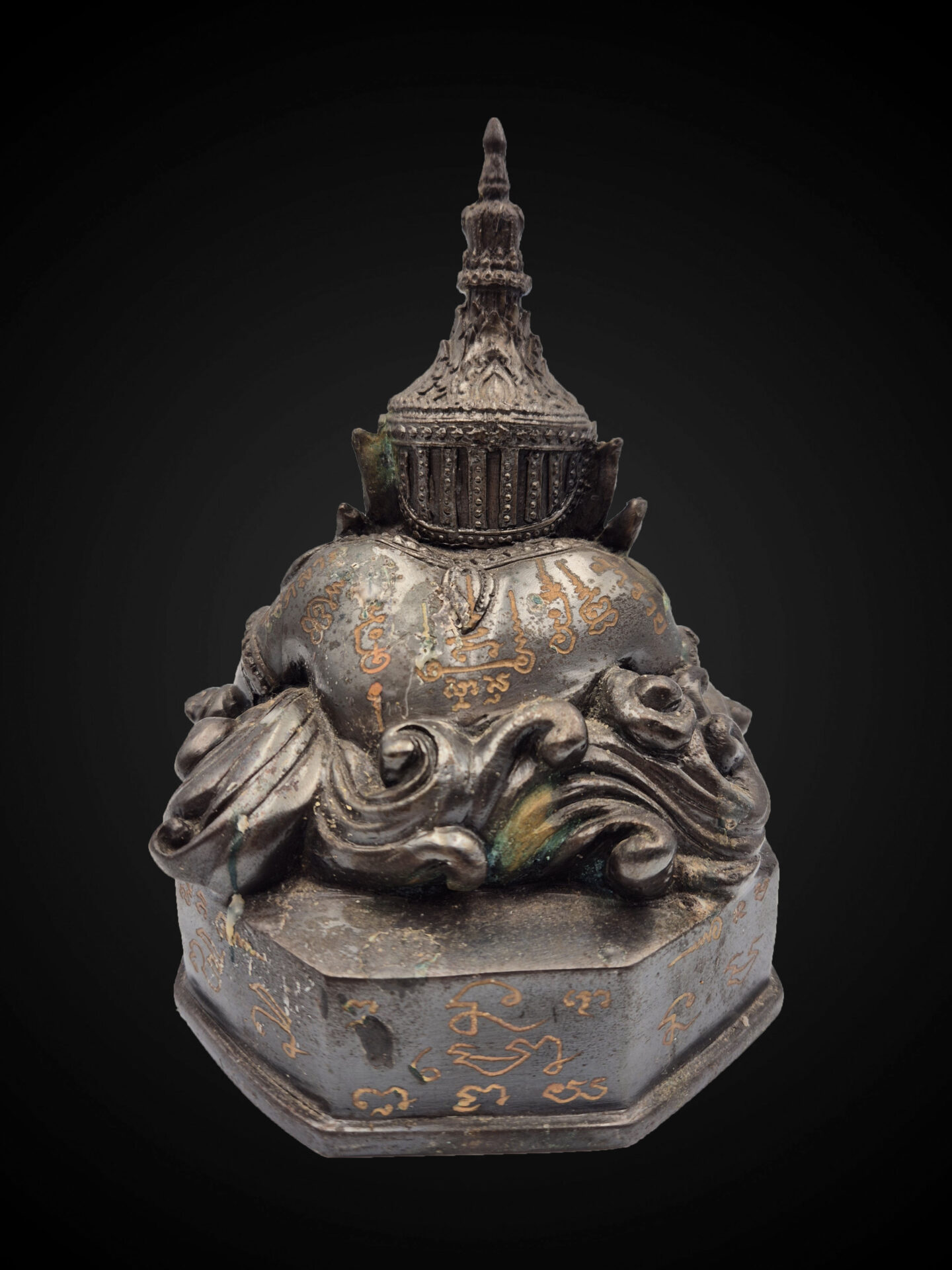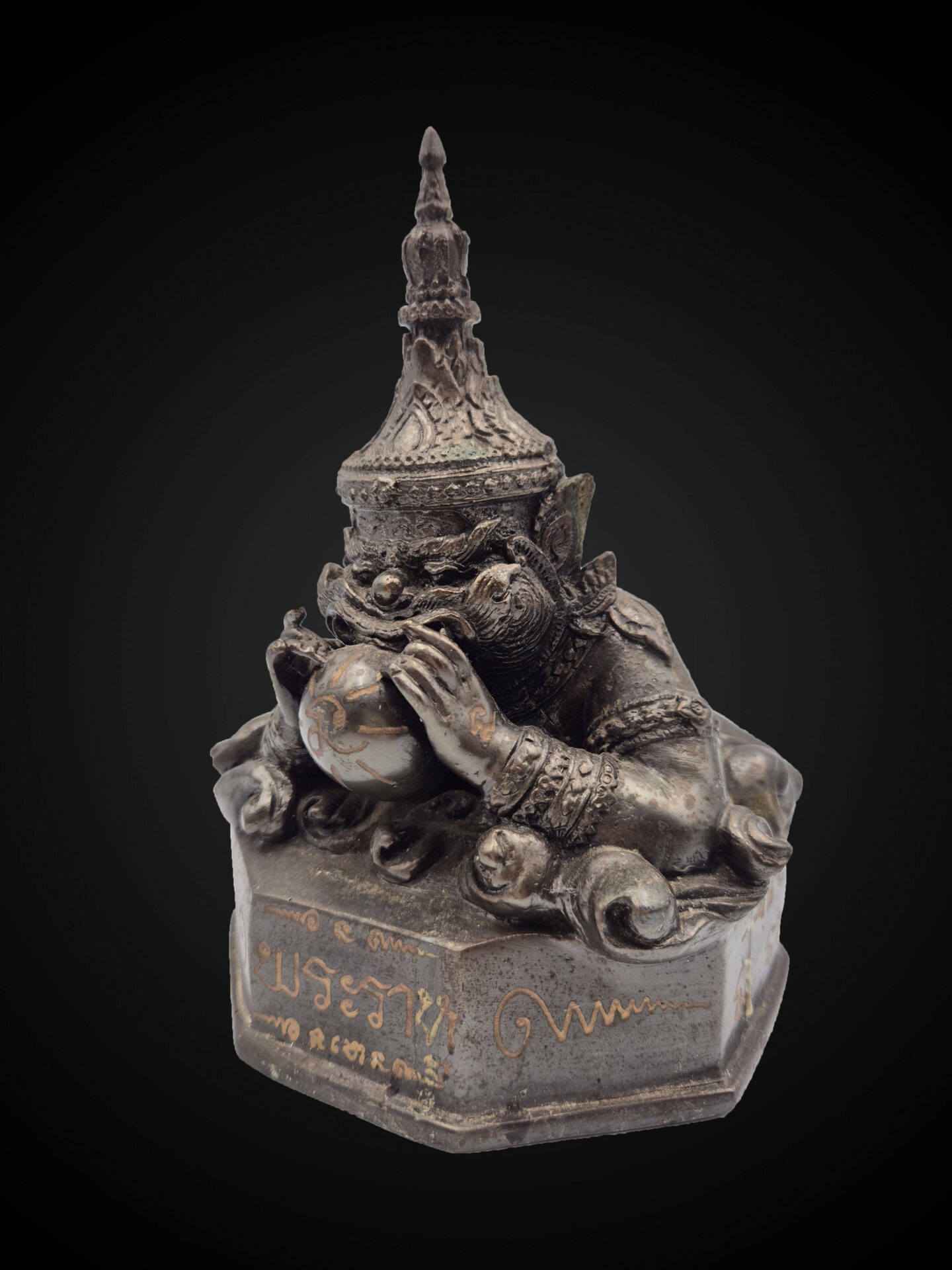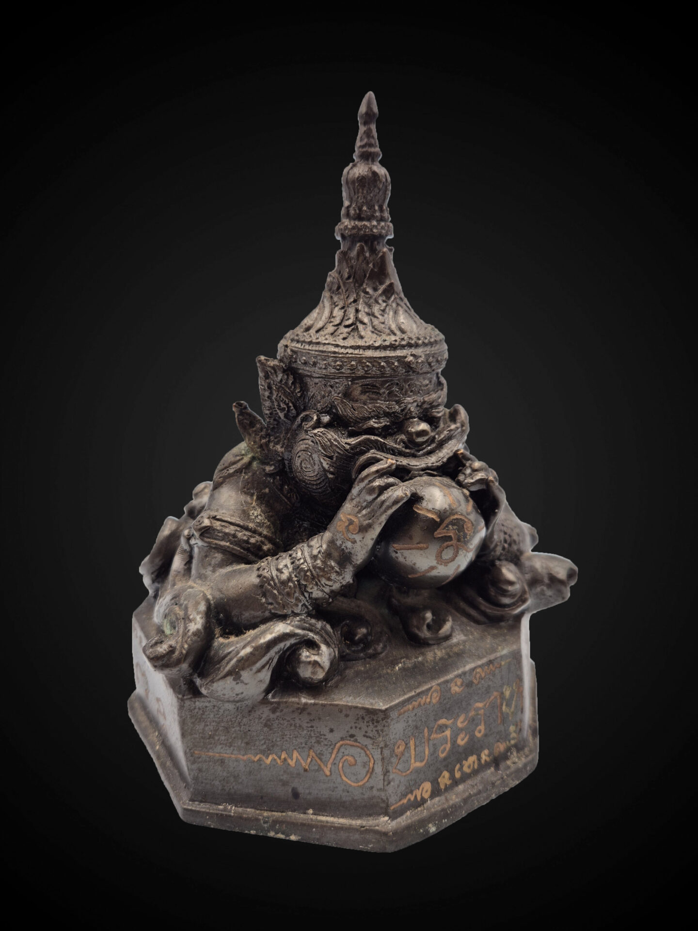The octagonal base is engraved with Thai inscriptions, including “พระราหู” (Phra Rahu), along with yantra-like markings that emphasize the ceremonial and consecrated nature of the piece. The underside reveals embedded sacred amulets, a traditional feature in Thai ritual objects, indicating the inclusion of blessed materials within the structure.