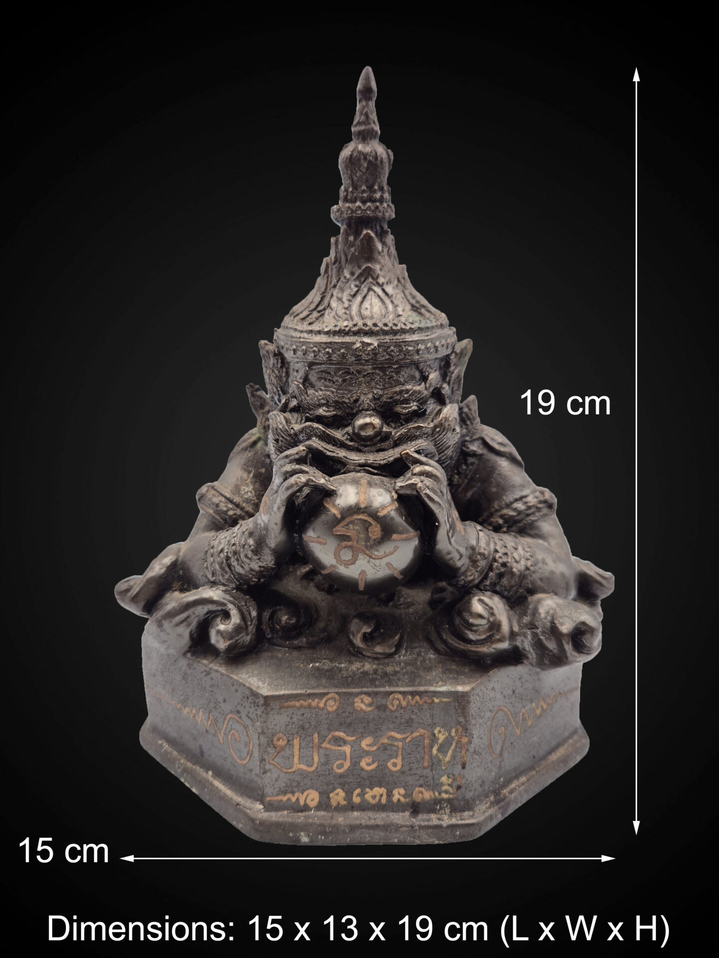 Distinctive elements — including the pronounced Yaksha-like facial features, layered ceremonial crown, and dynamic posture — express the integration of guardian aesthetics within Thai ritual art. The hands grasp a symbolic celestial sphere, reinforcing Rahu’s role as the devourer of eclipses and controller of karmic forces.