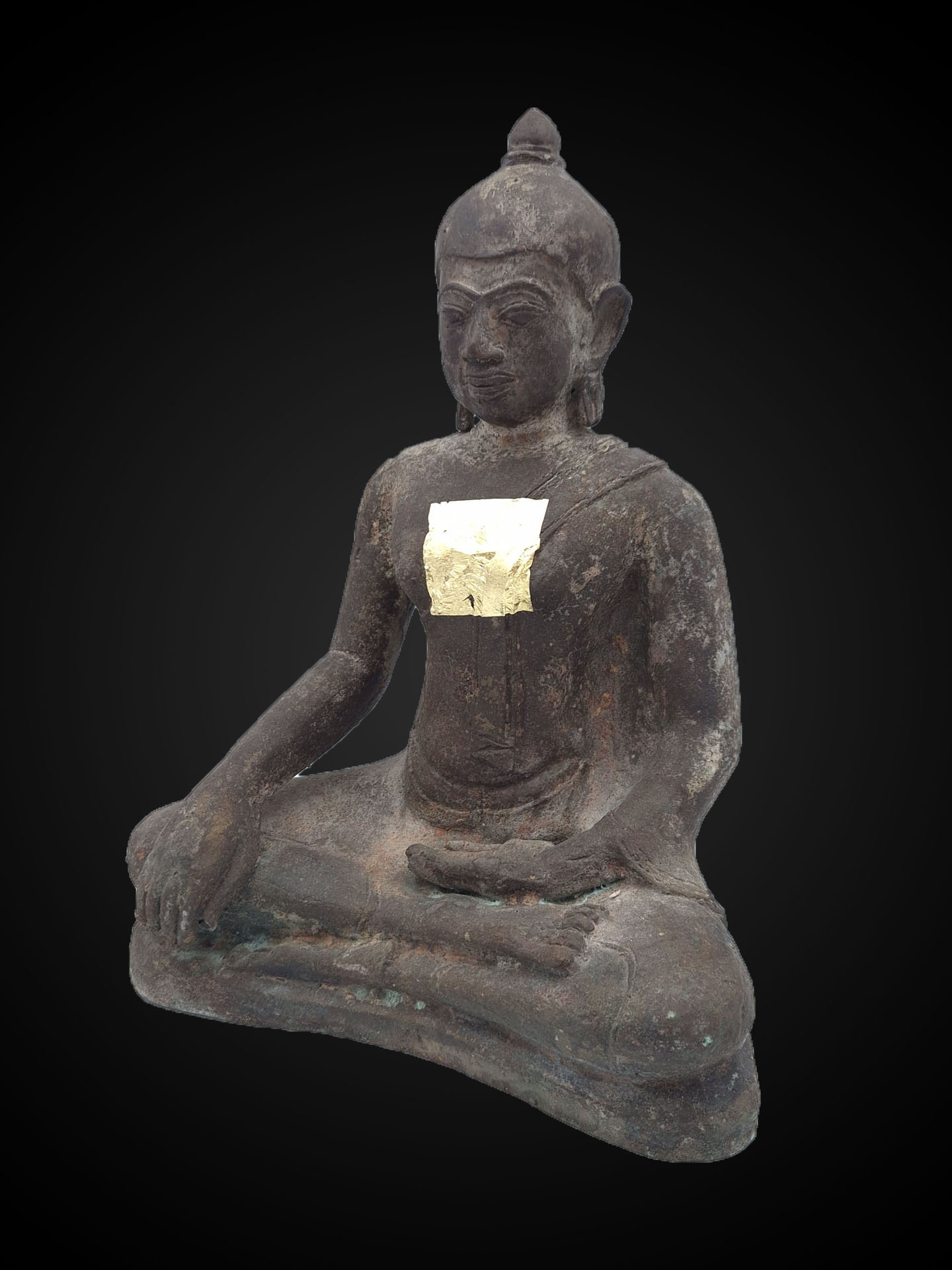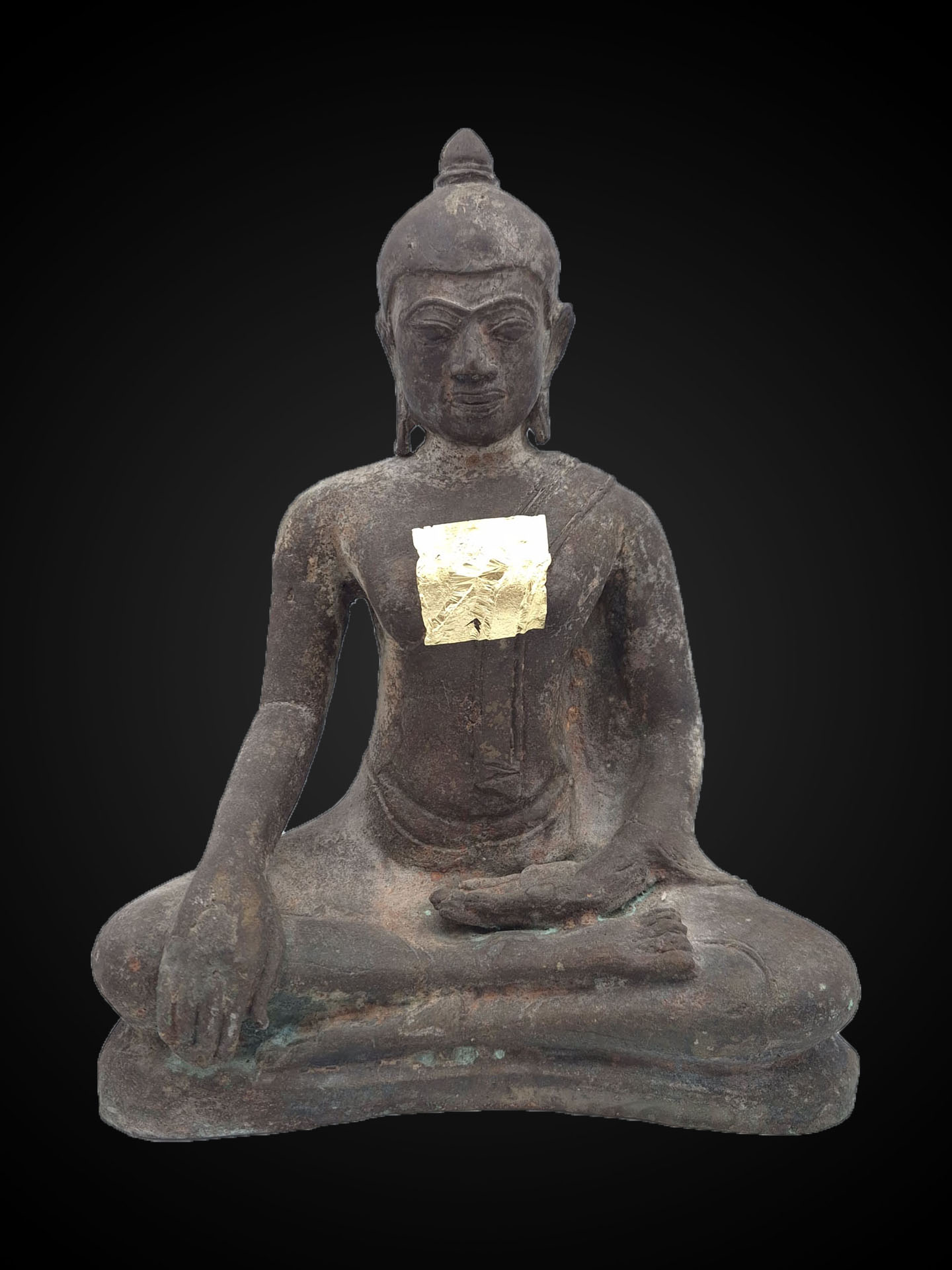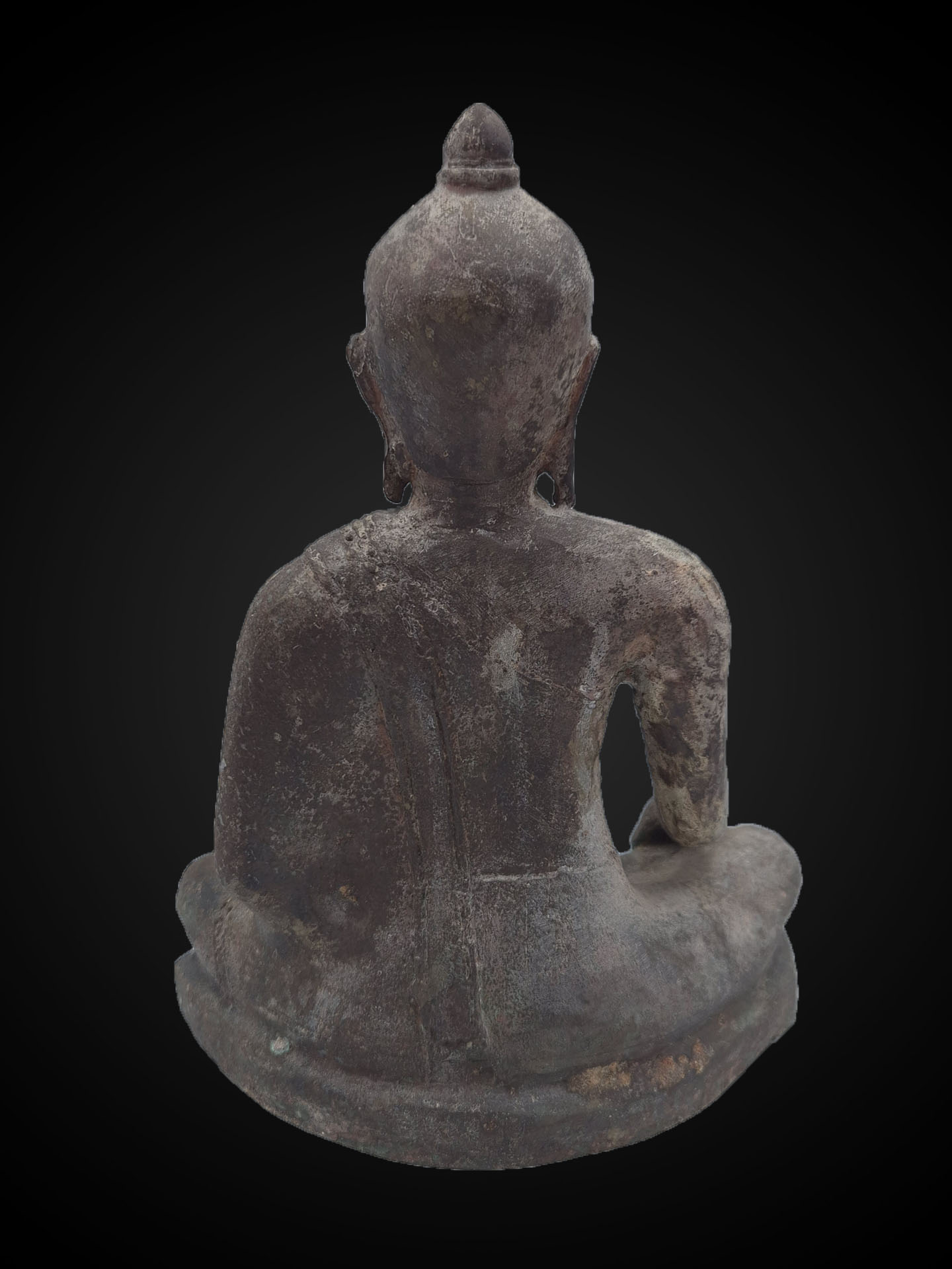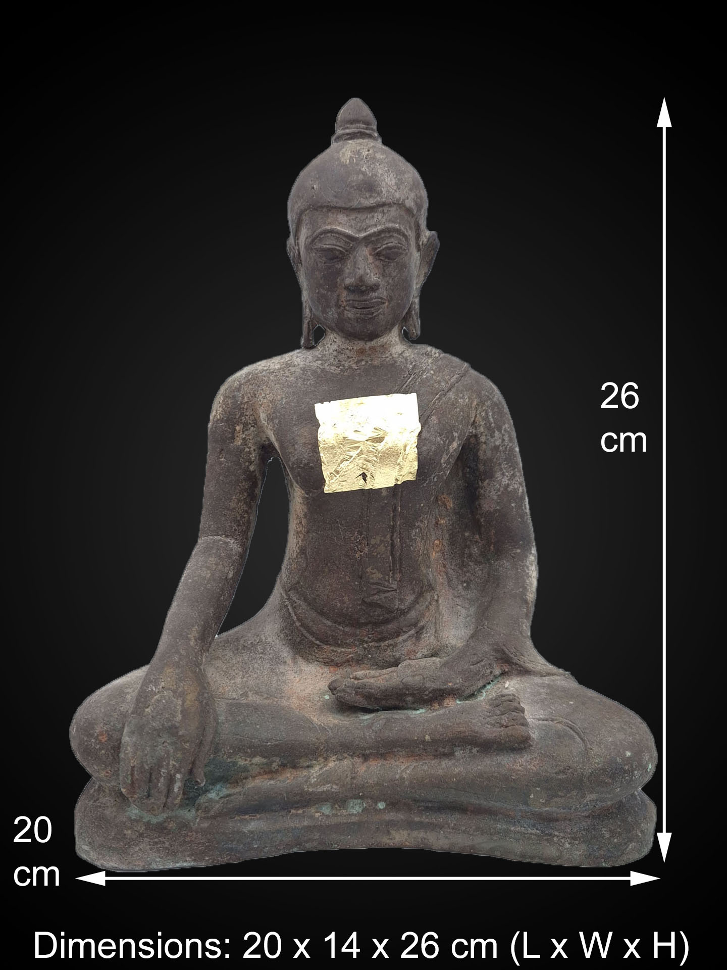 This U-Thong style Shakyamuni Buddha is depicted in the Earth-Touching (Bhumisparsha Mudra) posture, representing the moment of enlightenment when the Buddha called upon the earth to witness his triumph over illusion and temptation. The composition reflects the balanced proportions and spiritual authority associated with the central Thai sculptural lineage connected to the early Ayutthaya tradition.