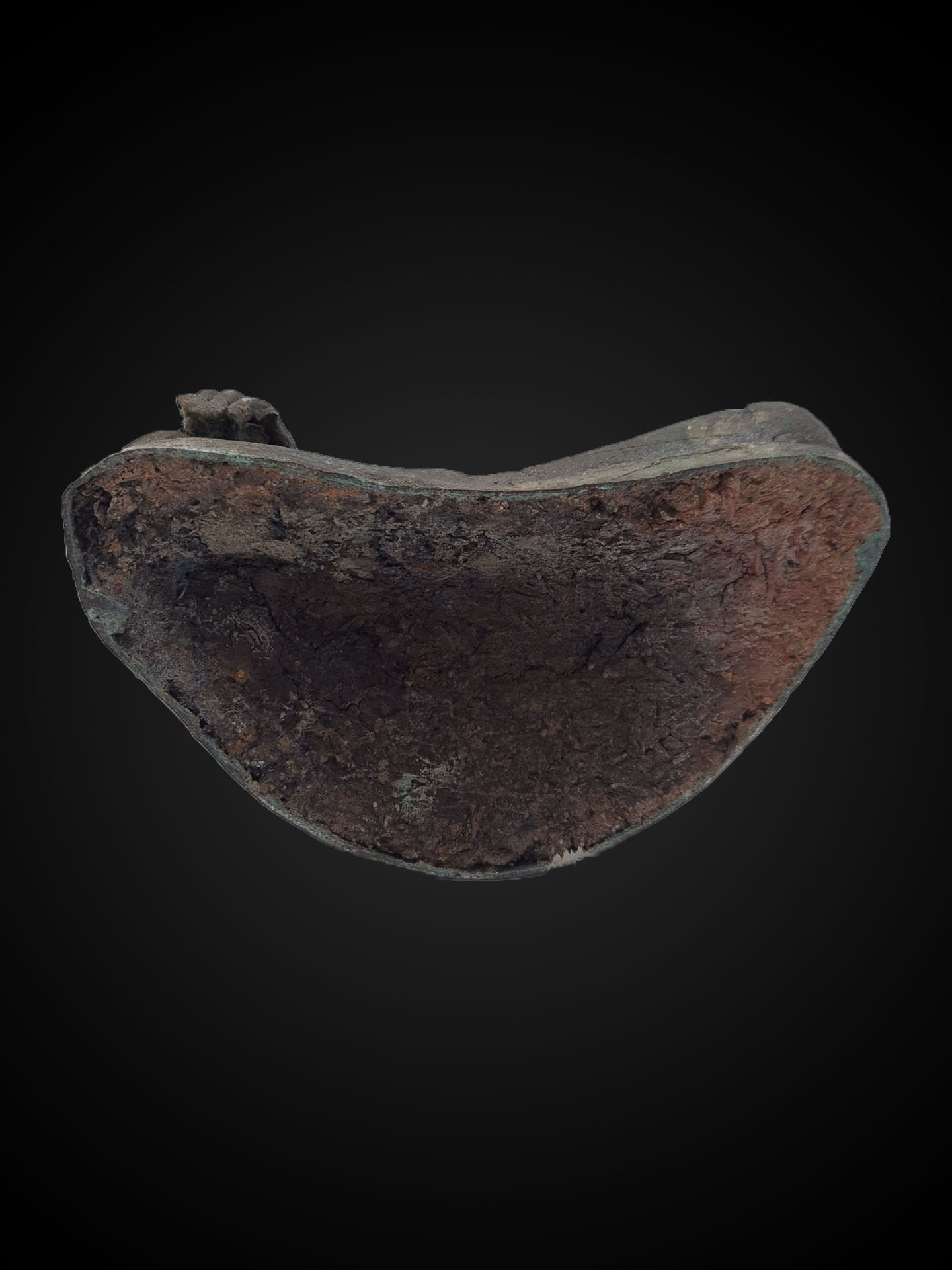 Distinctive elements — including the rounded cranial dome, compact torso, and strong facial structure with pronounced brows — express the stylistic vocabulary of this lineage. The bronze surface displays a developed green patina with areas of natural oxidation and tonal variation, giving the statue a dignified and time-softened appearance.